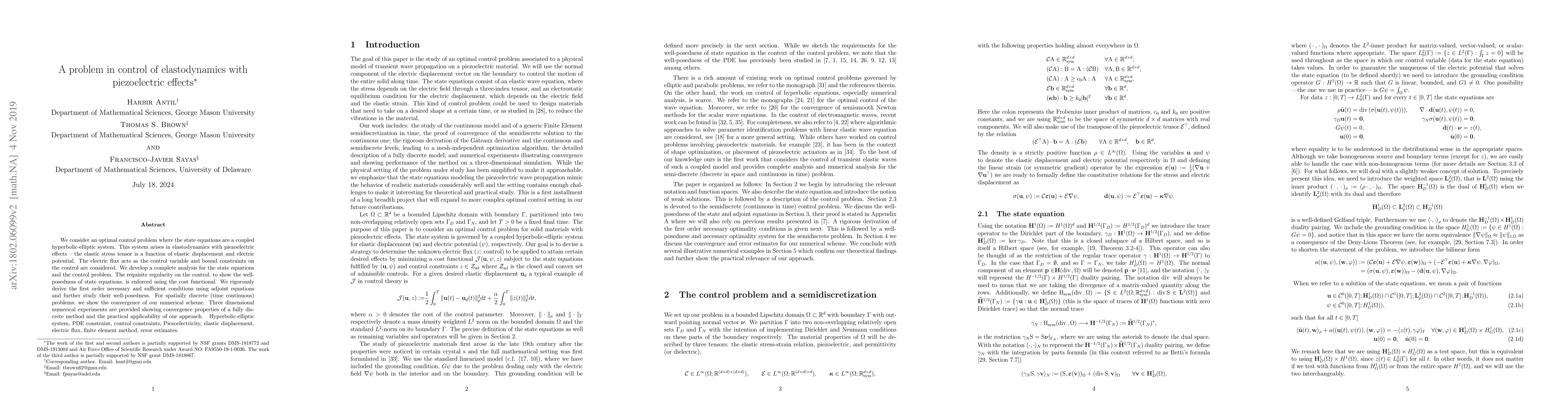 This paper addresses an optimal control problem in elastodynamics with piezoelectric effects, where the state equations are a coupled hyperbolic-elliptic system. It develops rigorous analysis and derives necessary and sufficient conditions for control, demonstrating the well-posedness of the state equations and the convergence of a numerical scheme through three-dimensional experiments.