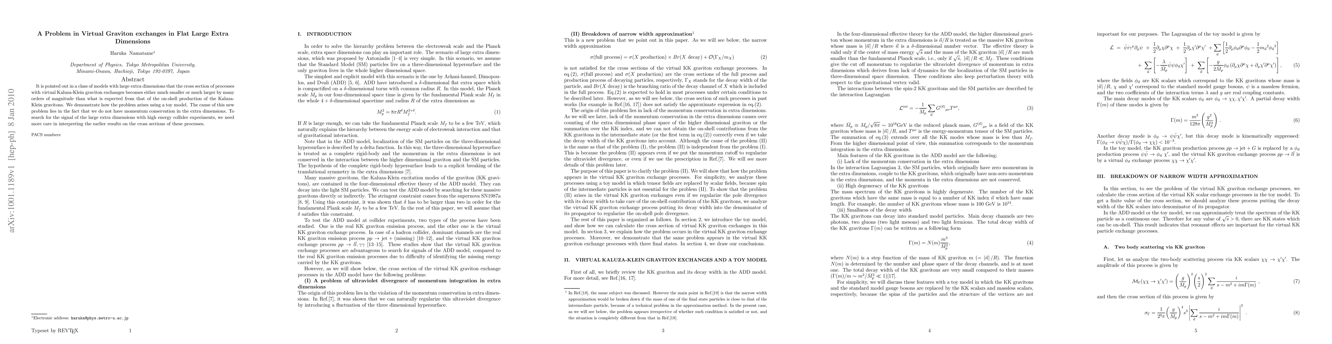 This paper identifies a discrepancy in the cross section of processes involving virtual Kaluza-Klein gravitons in models with large extra dimensions, where the results deviate significantly from on-shell production expectations. The issue stems from the lack of momentum conservation in extra dimensions, necessitating a reevaluation of experimental interpretations for signals of large extra dimensions.
