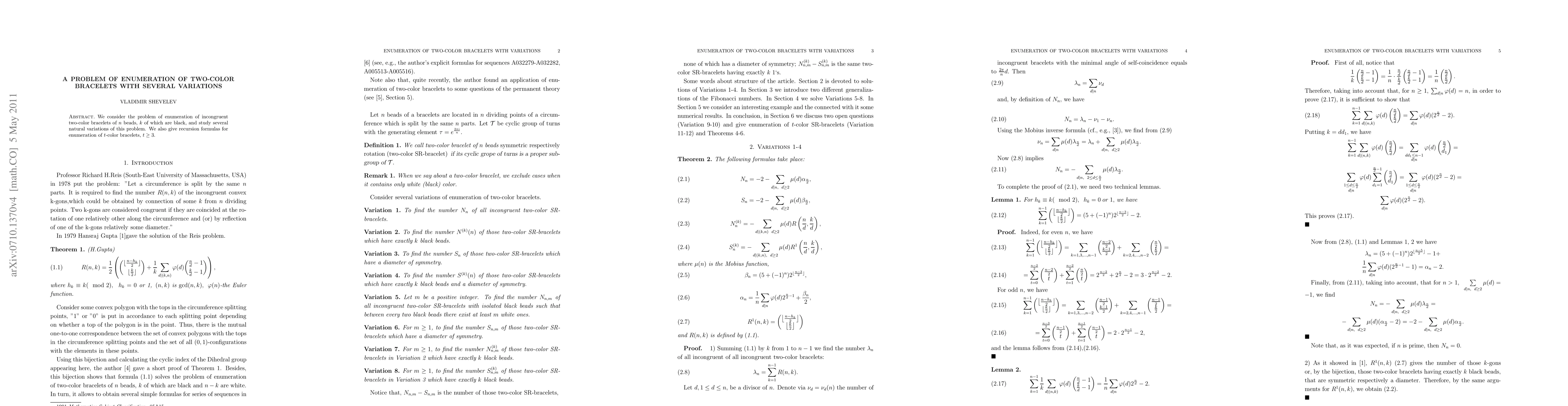 We consider the problem of enumeration of incongruent two-color bracelets of $n$ beads, $k$ of which are black, and study several natural variations of this problem. We also give recursion formulas for enumeration of $t$-color bracelets, $t\geq3.