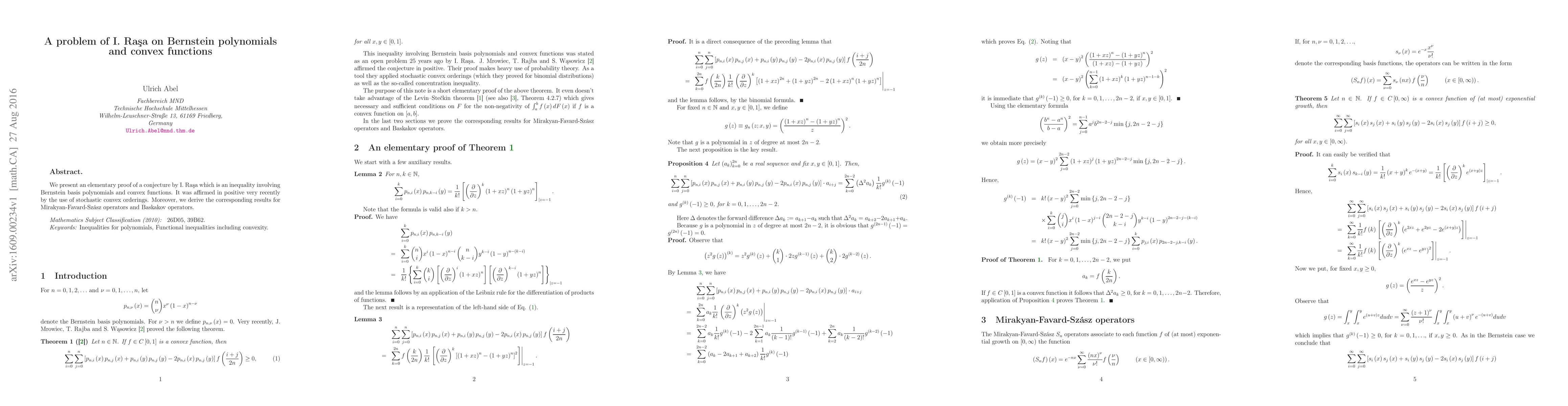 This paper offers an elementary proof for a conjecture by I. Rac{s}a concerning Bernstein polynomials and convex functions, previously confirmed via stochastic convex orderings. It also extends findings to Mirakyan-Favard-Sz'asz and Baskakov operators.