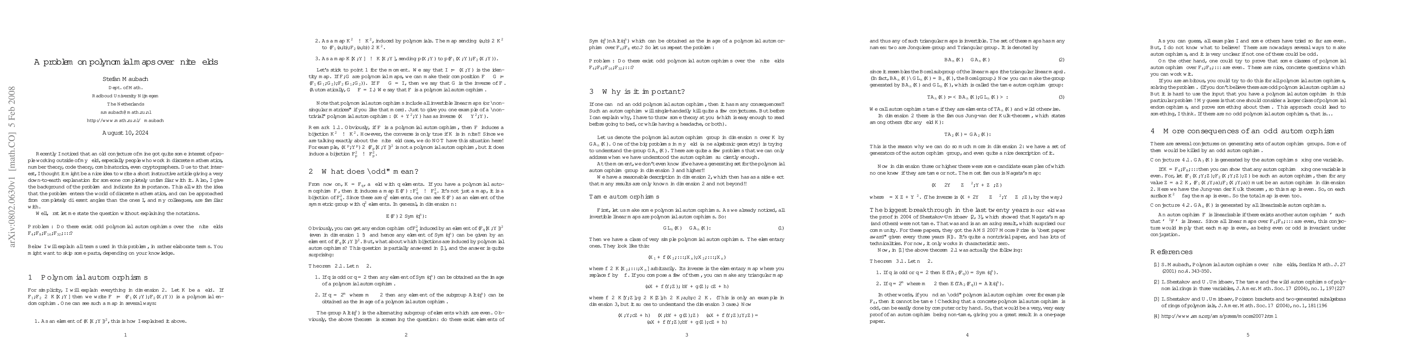 This is a short note that explains a problem on polynomial maps over finite fields for non-experts. The problem is: Do there exist odd polynomial automorphisms over the finite fields with 4,8,16,32,64,... elements? The explanation is very, very basic. Also, the background of the problem is given, and why it is of such importance. This all with the idea that the problem enters the world of discrete mathematics, and can be approached from completely different angles than normally used by people working in Affine Algebraic Geometry.