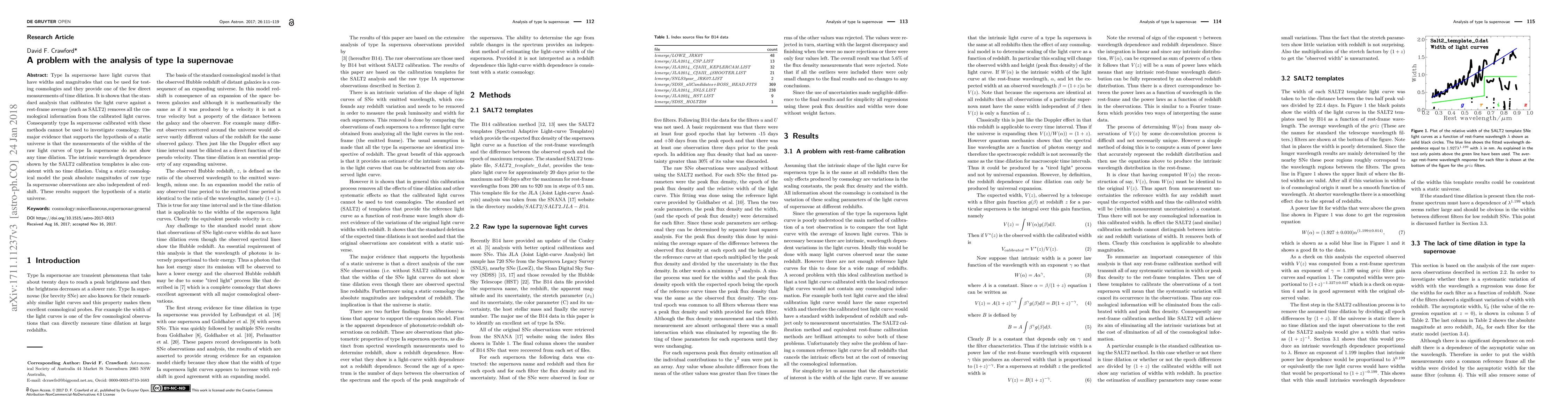 Type Ia supernovae have light curves that have widths and magnitudes that can be used for testing cosmologies and they provide one of the few direct measurements of time dilation. It is shown that the standard analysis that calibrates the light curve against a rest-frame average (such as SALT2) removes all the cosmological information from the calibrated light curves. Consequently type Ia supernovae calibrated with these methods cannot be used to investigate cosmology. The major evidence that supports the hypothesis of a static universe is that the measurements of the widths of the raw light curves of type Ia supernovae do not show any time dilation. The intrinsic wavelength dependence shown by the SALT2 calibration templates is also consistent with no time dilation. Using a static cosmological model the peak absolute magnitudes of raw type Ia supernovae observations are also independent of redshift. These results support the hypothesis of a static universe.