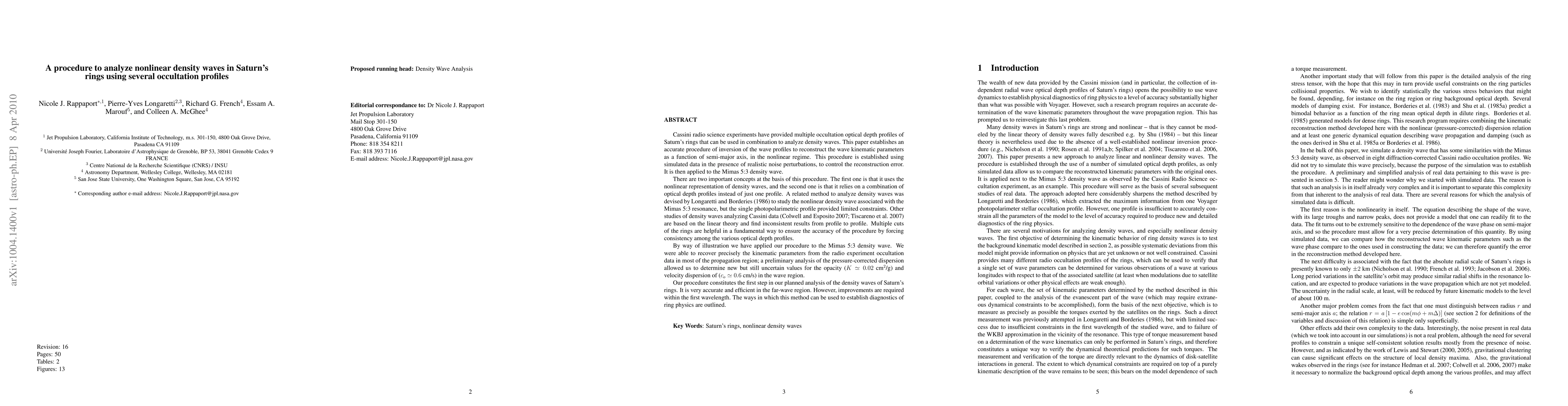 This paper presents a procedure for analyzing nonlinear density waves in Saturn's rings using multiple occultation profiles from Cassini's radio science experiments. The method accurately reconstructs wave kinematic parameters and was successfully applied to the Mimas 5:3 density wave, yielding preliminary values for opacity and velocity dispersion.