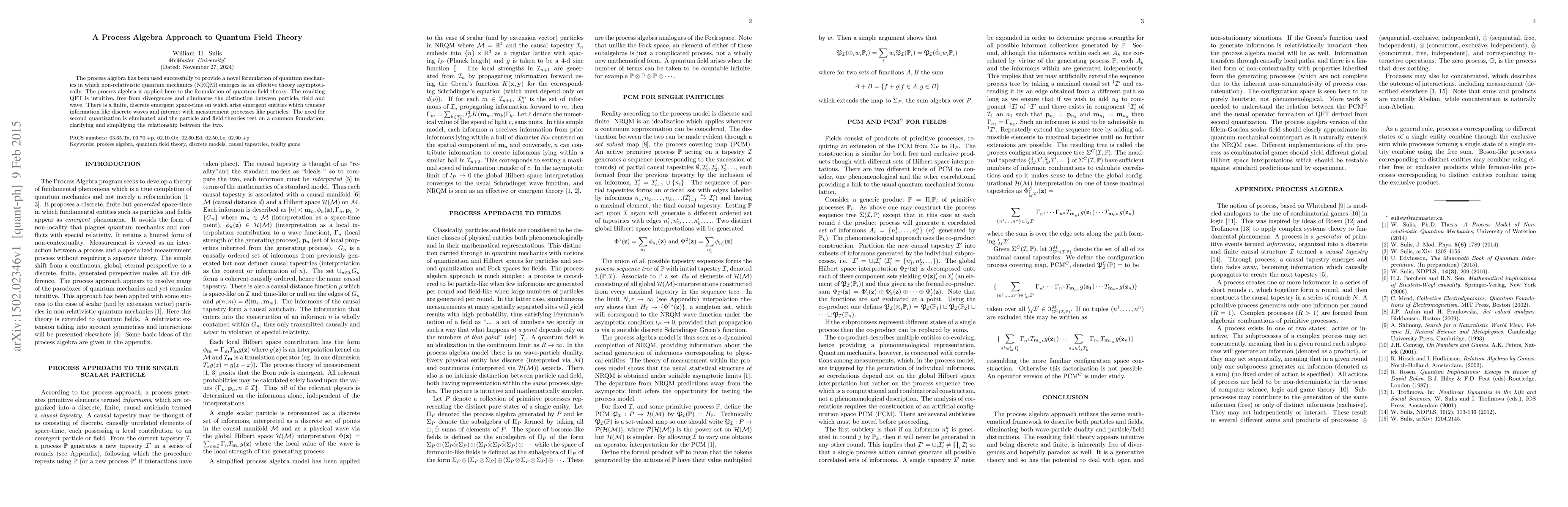 The process algebra has been used successfully to provide a novel formulation of quantum mechanics in which non-relativistic quantum mechanics (NRQM) emerges as an effective theory asymptotically. The process algebra is applied here to the formulation of quantum field theory. The resulting QFT is intuitive, free from divergences and eliminates the distinction between particle, field and wave. There is a finite, discrete emergent space-time on which arise emergent entities which transfer information like discrete waves and interact with measurement processes like particles. The need for second quantization is eliminated and the particle and field theories rest on a common foundation, clarifying and simplifying the relationship between the two.