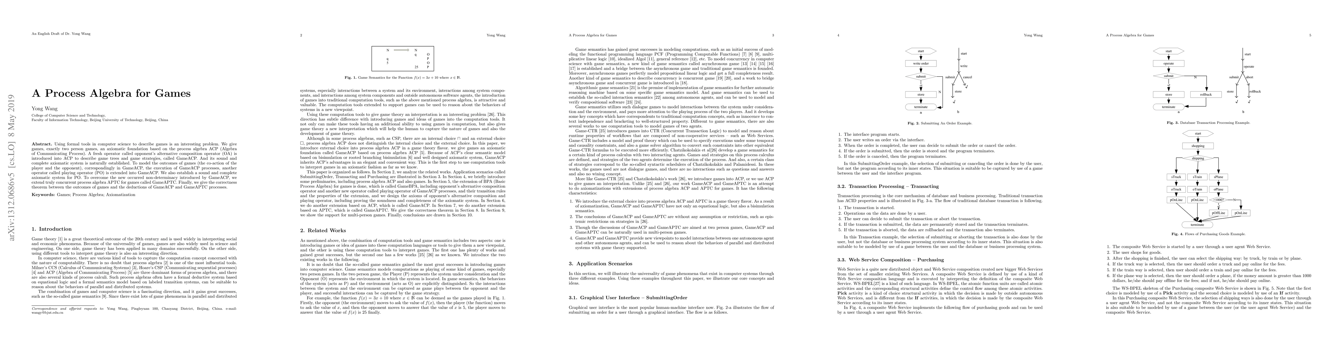 Using formal tools in computer science to describe games is an interesting problem. We give games, exactly two person games, an axiomatic foundation based on the process algebra ACP (Algebra of Communicating Process). A fresh operator called opponent's alternative composition operator (OA) is introduced into ACP to describe game trees and game strategies, called GameACP. And its sound and complete axiomatic system is naturally established. To model the outcomes of games (the co-action of the player and the opponent), correspondingly in GameACP, the execution of GameACP processes, another operator called playing operator (PO) is extended into GameACP. We also establish a sound and complete axiomatic system for PO. To overcome the new occurred non-determinacy introduced by GameACP, we extend truly concurrent process algebra APTC for games called GameAPTC. Finally, we give the correctness theorem between the outcomes of games and the deductions of GameACP and GameAPTC processes.