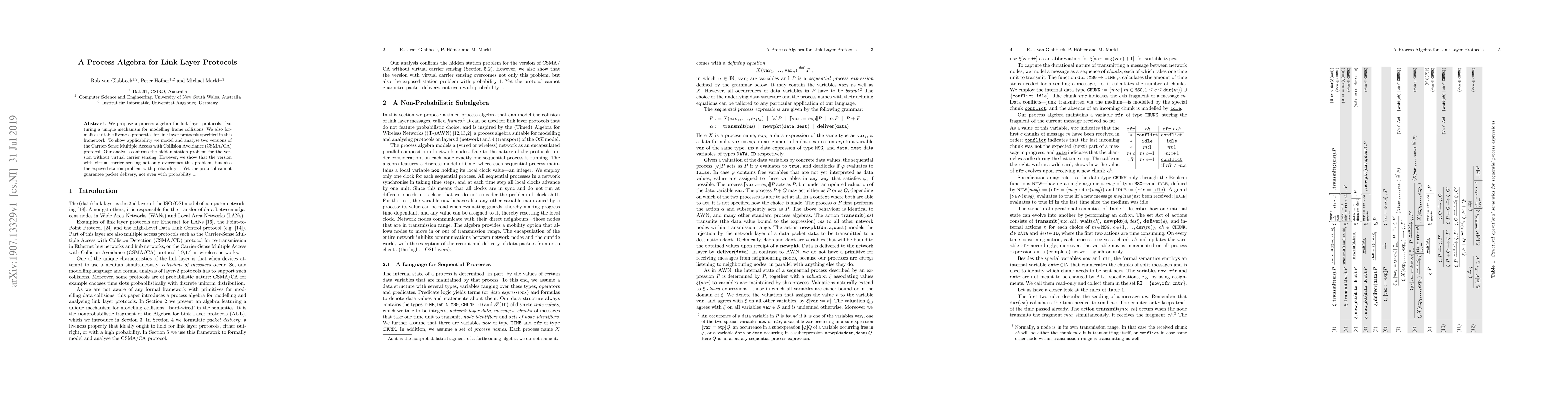 We propose a process algebra for link layer protocols, featuring a unique mechanism for modelling frame collisions. We also formalise suitable liveness properties for link layer protocols specified in this framework. To show applicability we model and analyse two versions of the Carrier-Sense Multiple Access with Collision Avoidance (CSMA/CA) protocol. Our analysis confirms the hidden station problem for the version without virtual carrier sensing. However, we show that the version with virtual carrier sensing not only overcomes this problem, but also the exposed station problem with probability 1. Yet the protocol cannot guarantee packet delivery, not even with probability 1.