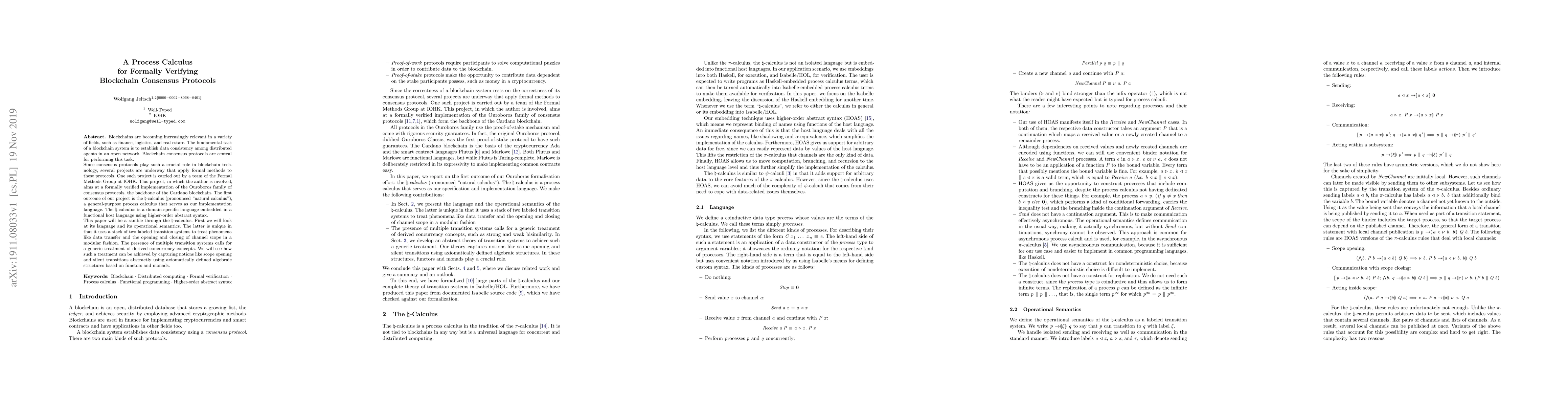 This paper introduces the $\natural$-calculus, a process calculus developed to formally verify blockchain consensus protocols, specifically the Ouroboros family used in the Cardano blockchain. The $\natural$-calculus employs a unique operational semantics using a stack of two labeled transition systems to manage data transfer and channel scope, supported by algebraic structures based on functors and monads.