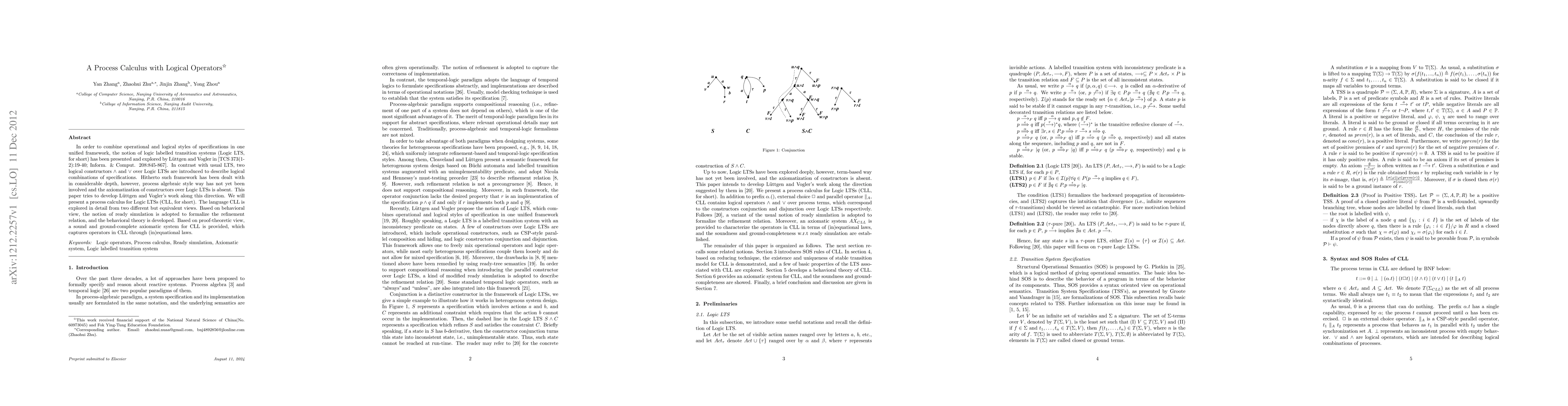In order to combine operational and logical styles of specifications in one unified framework, the notion of logic labelled transition systems (Logic LTS, for short) has been presented and explored by L\"{u}ttgen and Vogler in [TCS 373(1-2):19-40; Inform. & Comput. 208:845-867]. In contrast with usual LTS, two logical constructors $\wedge$ and $\vee$ over Logic LTSs are introduced to describe logical combinations of specifications. Hitherto such framework has been dealt with in considerable depth, however, process algebraic style way has not yet been involved and the axiomatization of constructors over Logic LTSs is absent. This paper tries to develop L\"{u}ttgen and Vogler's work along this direction. We will present a process calculus for Logic LTSs (CLL, for short). The language CLL is explored in detail from two different but equivalent views. Based on behavioral view, the notion of ready simulation is adopted to formalize the refinement relation, and the behavioral theory is developed. Based on proof-theoretic view, a sound and ground-complete axiomatic system for CLL is provided, which captures operators in CLL through (in)equational laws.