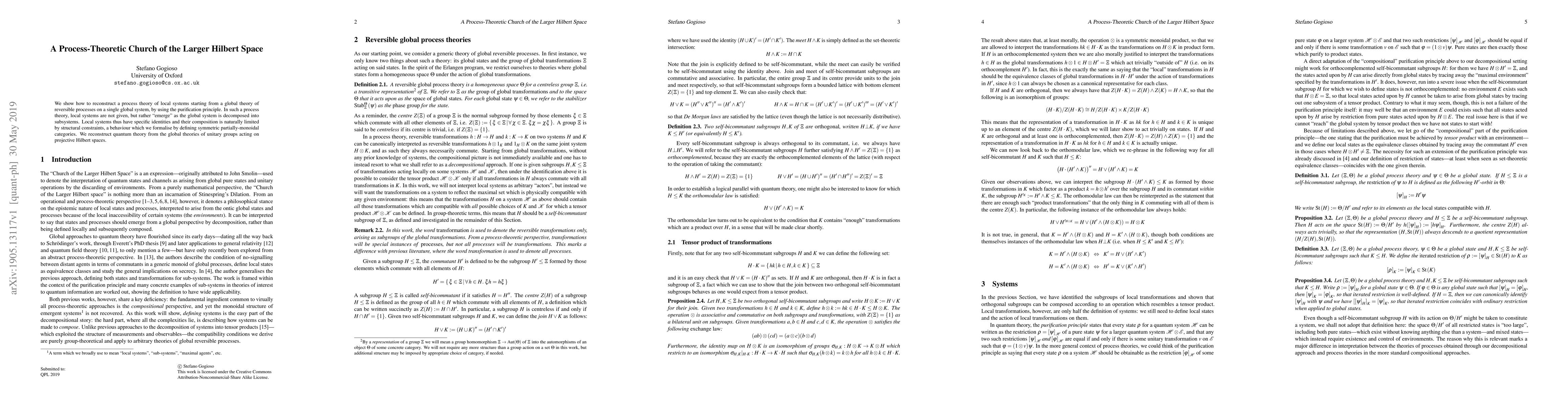 We show how to reconstruct a process theory of local systems starting from a global theory of reversible processes on a single global system, by using the purification principle. In such a process theory, local systems are not given, but rather `emerge' as the global system is decomposed into subsystems. Local systems thus have specific identities and their composition is naturally limited by structural constraints, a behaviour which we formalise by defining symmetric partially-monoidal categories. We reconstruct quantum theory from the global theories of unitary groups acting on projective Hilbert spaces.