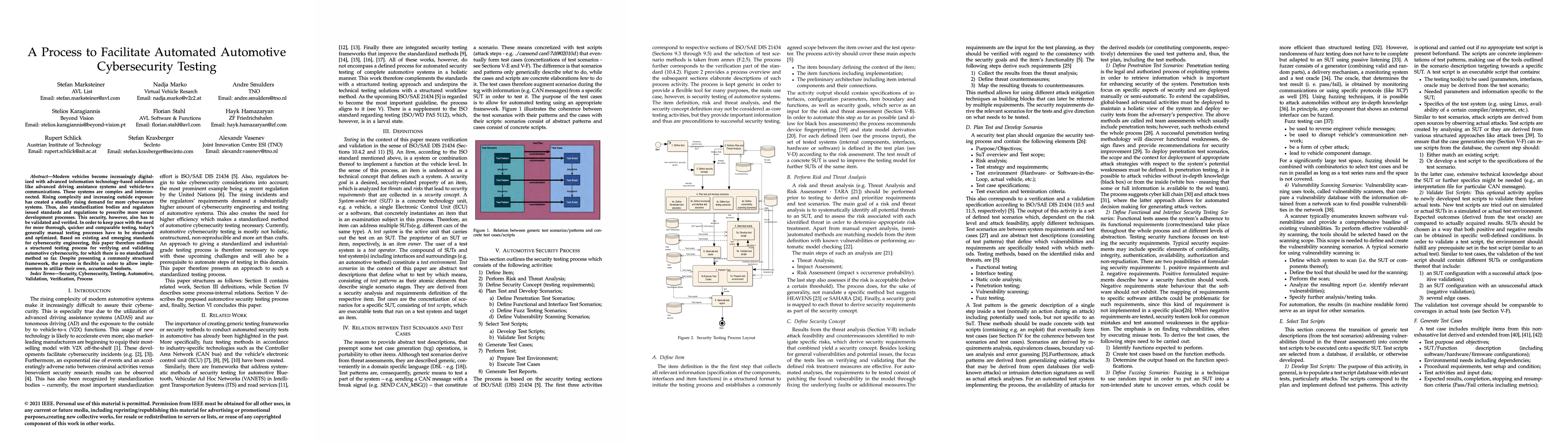 Modern vehicles become increasingly digitalized with advanced information technology-based solutions like advanced driving assistance systems and vehicle-to-x communications. These systems are complex and interconnected. Rising complexity and increasing outside exposure has created a steadily rising demand for more cyber-secure systems. Thus, also standardization bodies and regulators issued standards and regulations to prescribe more secure development processes. This security, however, also has to be validated and verified. In order to keep pace with the need for more thorough, quicker and comparable testing, today's generally manual testing processes have to be structured and optimized. Based on existing and emerging standards for cybersecurity engineering, this paper therefore outlines a structured testing process for verifying and validating automotive cybersecurity, for which there is no standardized method so far. Despite presenting a commonly structured framework, the process is flexible in order to allow implementers to utilize their own, accustomed toolsets.