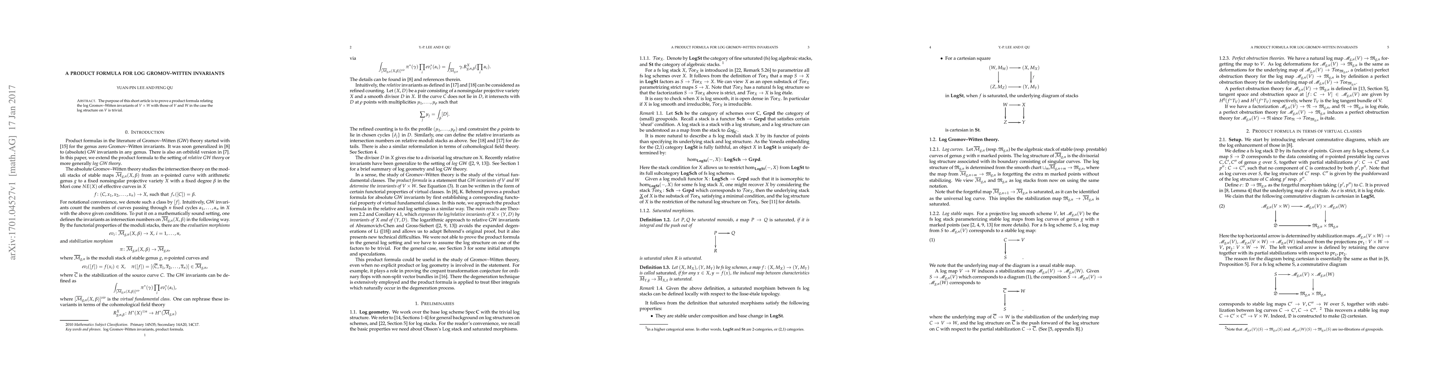 Summary: This paper establishes a product formula connecting log Gromov-Witten invariants of the product space $V \times W$ with those of individual spaces $V$ and $W$, assuming a trivial log structure on $V$. The result provides a deeper understanding of the relationship between these invariants in log geometric settings.