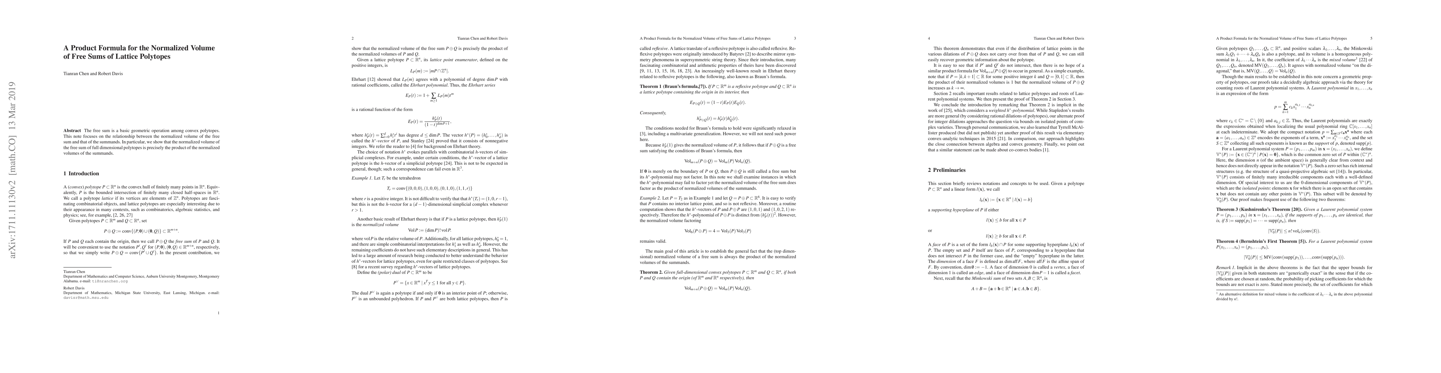 This paper explores the geometric operation of free sum among convex polytopes, demonstrating that the normalized volume of the free sum of full-dimensional polytopes equals the product of the normalized volumes of the individual summands.