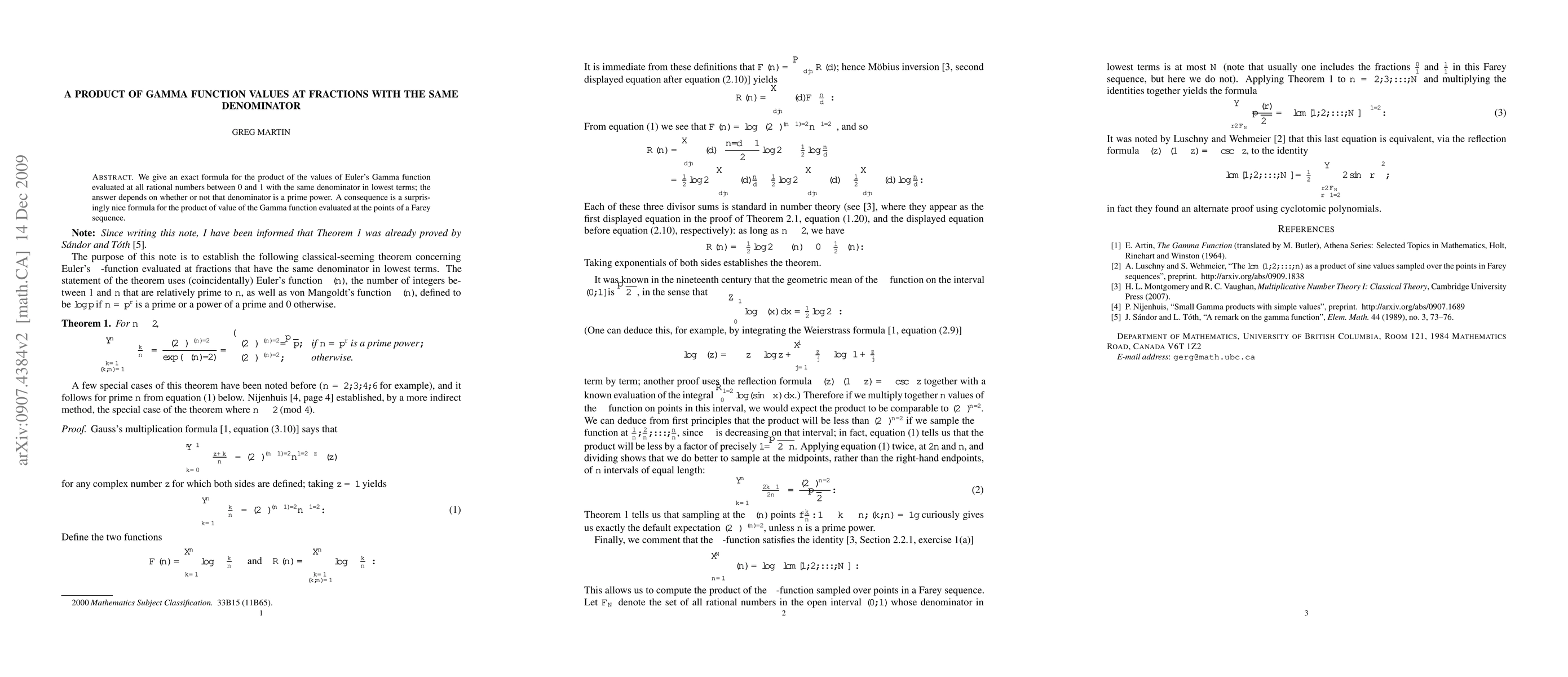 Let D(n) be the set of all fractions in the unit interval whose denominator in lowest terms equals $n$. We evaluate the product of the values of the Gamma function at the points of D(n), as a function of $n$; the answer depends on whether or not $n$ is a prime power.