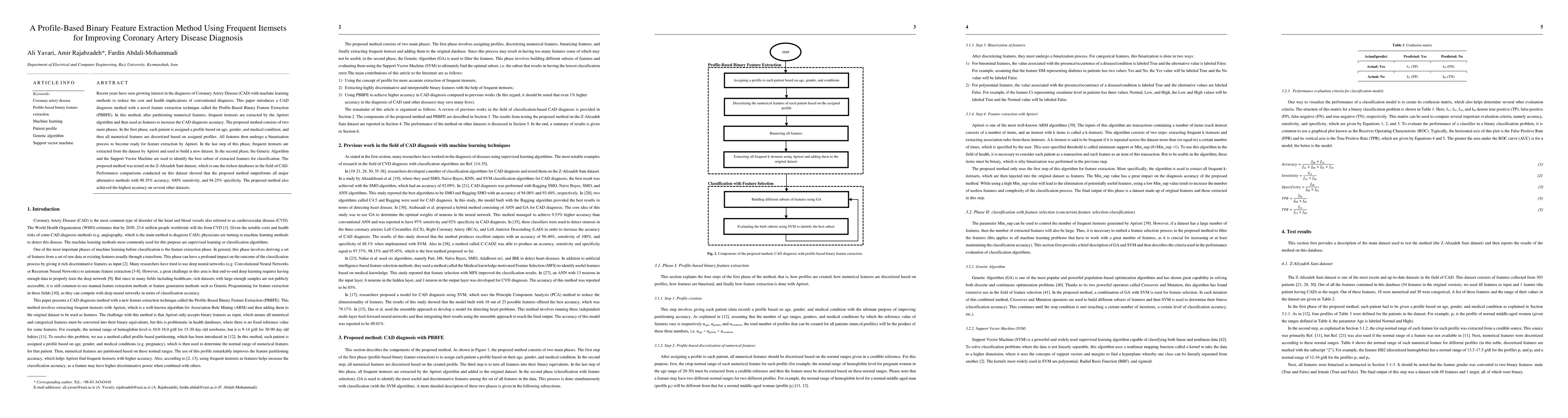 Recent years have seen growing interest in the diagnosis of Coronary Artery Disease (CAD) with machine learning methods to reduce the cost and health implications of conventional diagnosis. This paper introduces a CAD diagnosis method with a novel feature extraction technique called the Profile-Based Binary Feature Extraction (PBBFE). In this method, after partitioning numerical features, frequent itemsets are extracted by the Apriori algorithm and then used as features to increase the CAD diagnosis accuracy. The proposed method consists of two main phases. In the first phase, each patient is assigned a profile based on age, gender, and medical condition, and then all numerical features are discretized based on assigned profiles. All features then undergo a binarization process to become ready for feature extraction by Apriori. In the last step of this phase, frequent itemsets are extracted from the dataset by Apriori and used to build a new dataset. In the second phase, the Genetic Algorithm and the Support Vector Machine are used to identify the best subset of extracted features for classification. The proposed method was tested on the Z-Alizadeh Sani dataset, which is one the richest databases in the field of CAD. Performance comparisons conducted on this dataset showed that the proposed method outperforms all major alternative methods with 98.35% accuracy, 100% sensitivity, and 94.25% specificity. The proposed method also achieved the highest accuracy on several other datasets.