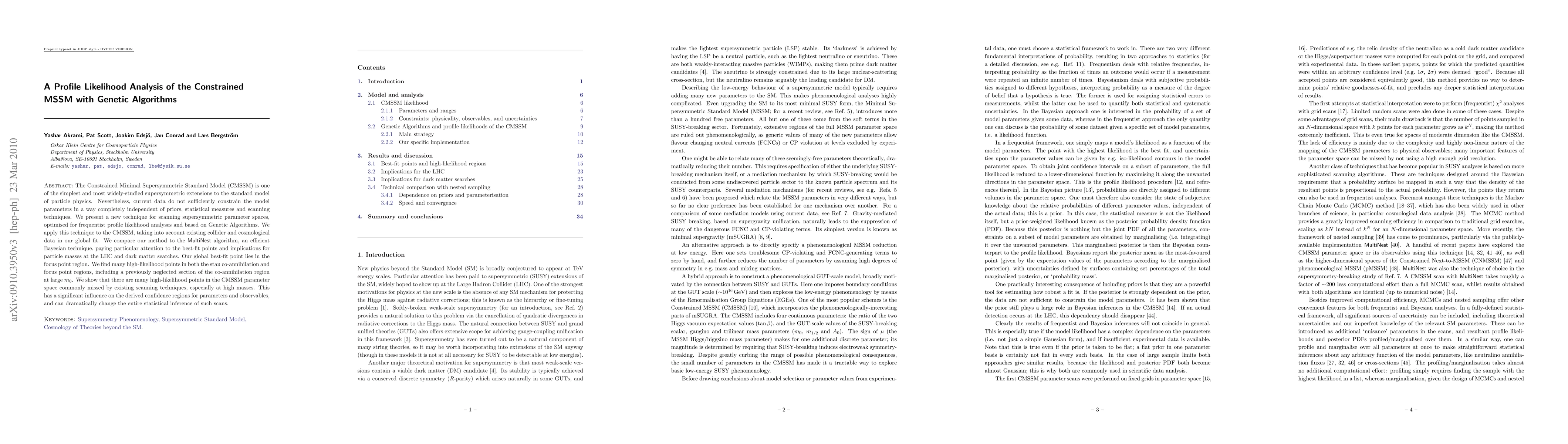 The Constrained Minimal Supersymmetric Standard Model (CMSSM) is one of the simplest and most widely-studied supersymmetric extensions to the standard model of particle physics. Nevertheless, current data do not sufficiently constrain the model parameters in a way completely independent of priors, statistical measures and scanning techniques. We present a new technique for scanning supersymmetric parameter spaces, optimised for frequentist profile likelihood analyses and based on Genetic Algorithms. We apply this technique to the CMSSM, taking into account existing collider and cosmological data in our global fit. We compare our method to the MultiNest algorithm, an efficient Bayesian technique, paying particular attention to the best-fit points and implications for particle masses at the LHC and dark matter searches. Our global best-fit point lies in the focus point region. We find many high-likelihood points in both the stau co-annihilation and focus point regions, including a previously neglected section of the co-annihilation region at large m_0. We show that there are many high-likelihood points in the CMSSM parameter space commonly missed by existing scanning techniques, especially at high masses. This has a significant influence on the derived confidence regions for parameters and observables, and can dramatically change the entire statistical inference of such scans.