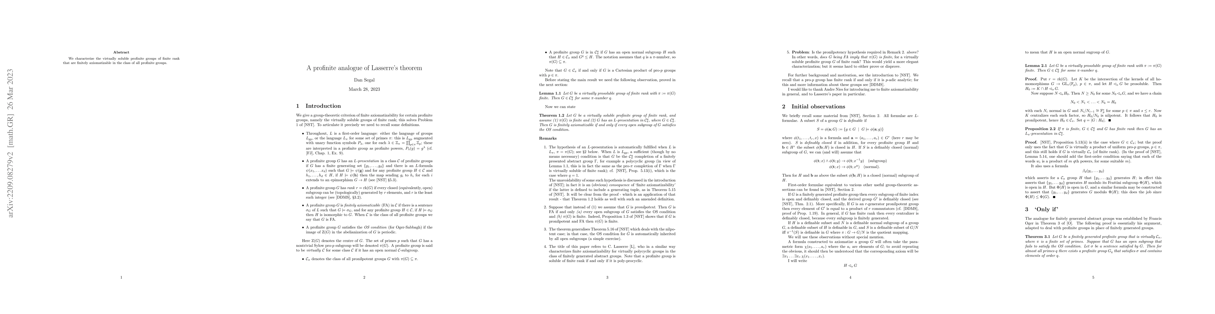 A soluble pro-p group of finite rank is finitely axiomatizable in the class of all profinite groups if and only if for each open subgroup H, the image of Z(H) in the abelianization of H is finite, subject to some suitable hypothesis of finite presentability.