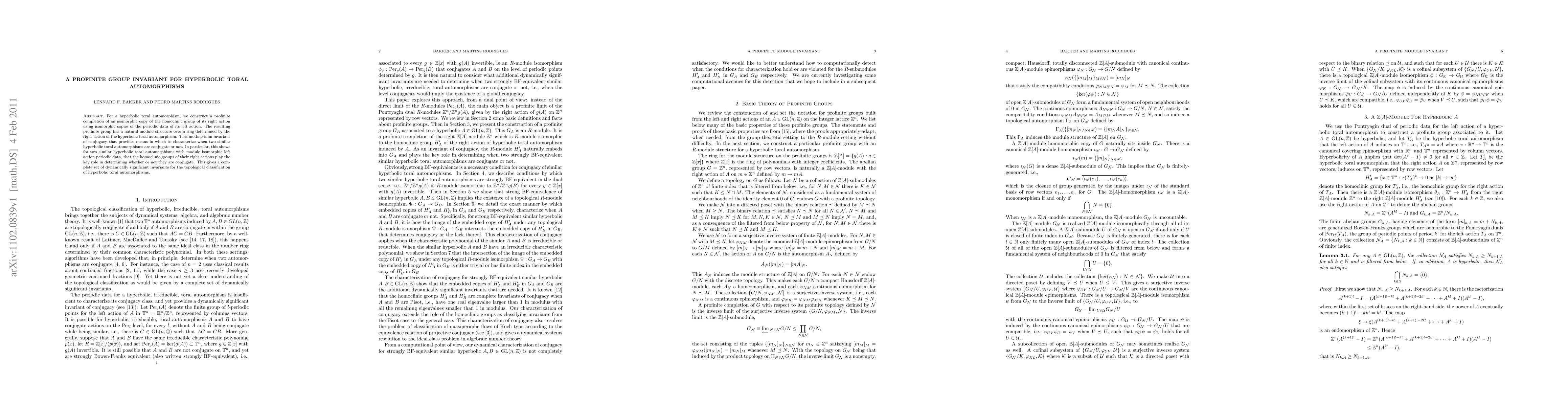 This paper constructs a profinite group invariant for hyperbolic toral automorphisms by utilizing periodic data from both the left and right actions. The profinite group, with a module structure over a ring derived from the right action, serves as a conjugacy invariant, providing a complete set of dynamical invariants for classifying such automorphisms.