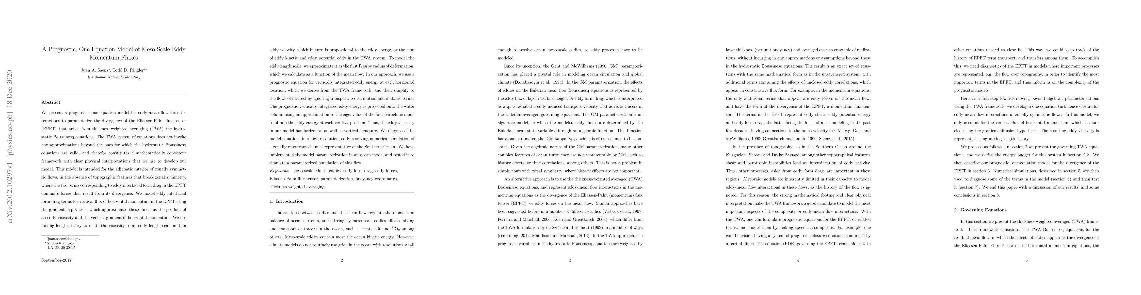 We present a prognostic, one-equation model for eddy-mean flow interactions to parameterize the divergence of the Eliassen-Palm flux tensor (EPFT) that arises from thickness-weighted averaging (TWA) the hydrostatic Boussinesq equations. The TWA system of equations does not invoke approximations beyond those for which the hydrostatic Boussinesq equations are valid, constituting a mathematically consistent framework with clear physical interpretations. This model is intended for the adiabatic interior of zonally symmetric flows, in the absence of topographic features, where terms corresponding to eddy interfacial form drag in the EPFT dominate forces. We model eddy interfacial form drag terms for vertical flux of horizontal momentum using the gradient hypothesis, as the product of an eddy viscosity and the vertical gradient of horizontal momentum. We use mixing length theory to relate viscosity to an eddy length scale and an eddy velocity, which is proportional to the eddy energy in the TWA system. The eddy length scale is modeled as the first Rossby radius of deformation, which we calculate as a function of the mean flow. We use a prognostic equation for vertically integrated eddy energy at each horizontal location, which we derive from the TWA framework, and then simplify to the flows of interest by ignoring transport, redistribution and diabatic terms. The prognostic vertically integrated eddy energy is projected onto the water column using the eigenvalue of the first baroclinic mode to obtain the eddy energy at each vertical position. The eddy viscosity has horizontal as well as vertical structure. We diagnosed the model equations in an eddy resolving numerical simulation of a zonally re-entrant channel representative of the Southern Ocean. We have implemented the model parameterization in an ocean model and tested it to simulate a parameterized simulation of this flow.