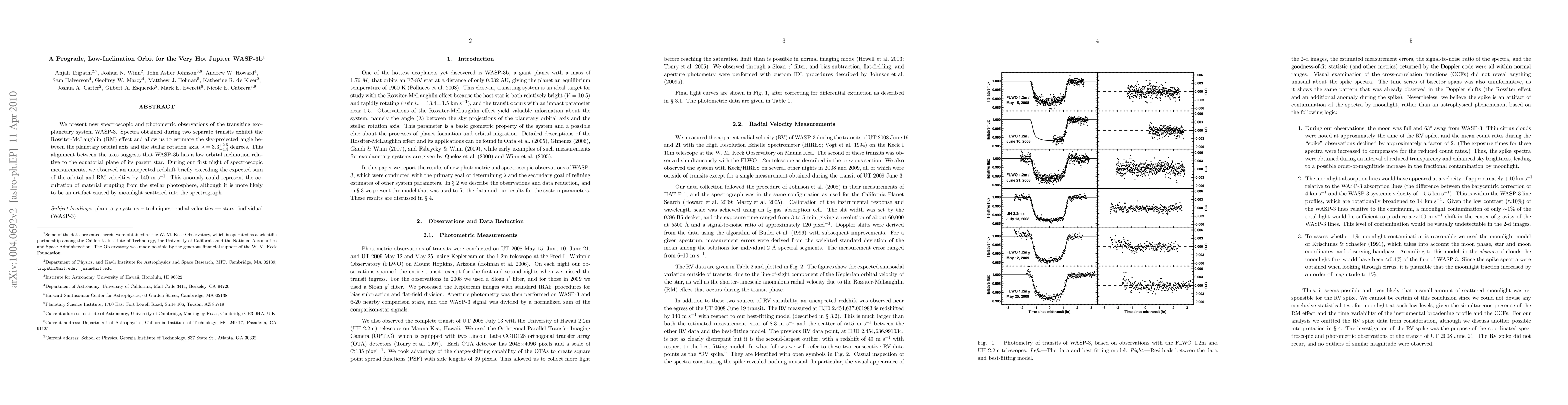 We present new spectroscopic and photometric observations of the transiting exoplanetary system WASP-3. Spectra obtained during two separate transits exhibit the Rossiter-McLaughlin (RM) effect and allow us to estimate the sky-projected angle between the planetary orbital axis and the stellar rotation axis, lambda = 3.3^{+2.5}_{-4.4} degrees. This alignment between the axes suggests that WASP-3b has a low orbital inclination relative to the equatorial plane of its parent star. During our first night of spectroscopic measurements, we observed an unexpected redshift briefly exceeding the expected sum of the orbital and RM velocities by 140 m/s. This anomaly could represent the occultation of material erupting from the stellar photosphere, although it is more likely to be an artifact caused by moonlight scattered into the spectrograph.