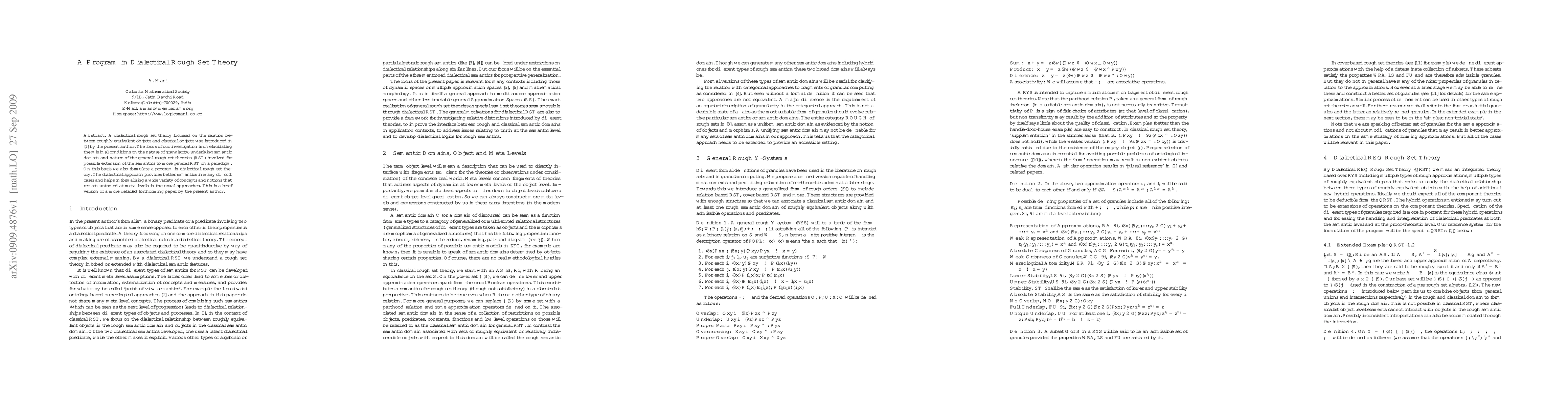 A dialectical rough set theory focussed on the relation between roughly equivalent objects and classical objects was introduced in \cite{AM699} by the present author. The focus of our investigation is on elucidating the minimal conditions on the nature of granularity, underlying semantic domain and nature of the general rough set theories (RST) involved for possible extension of the semantics to more general RST on a paradigm. On this basis we also formulate a program in dialectical rough set theory. The dialectical approach provides better semantics in many difficult cases and helps in formalising a wide variety of concepts and notions that remain untamed at meta levels in the usual approaches. This is a brief version of a more detailed forthcoming paper by the present author.