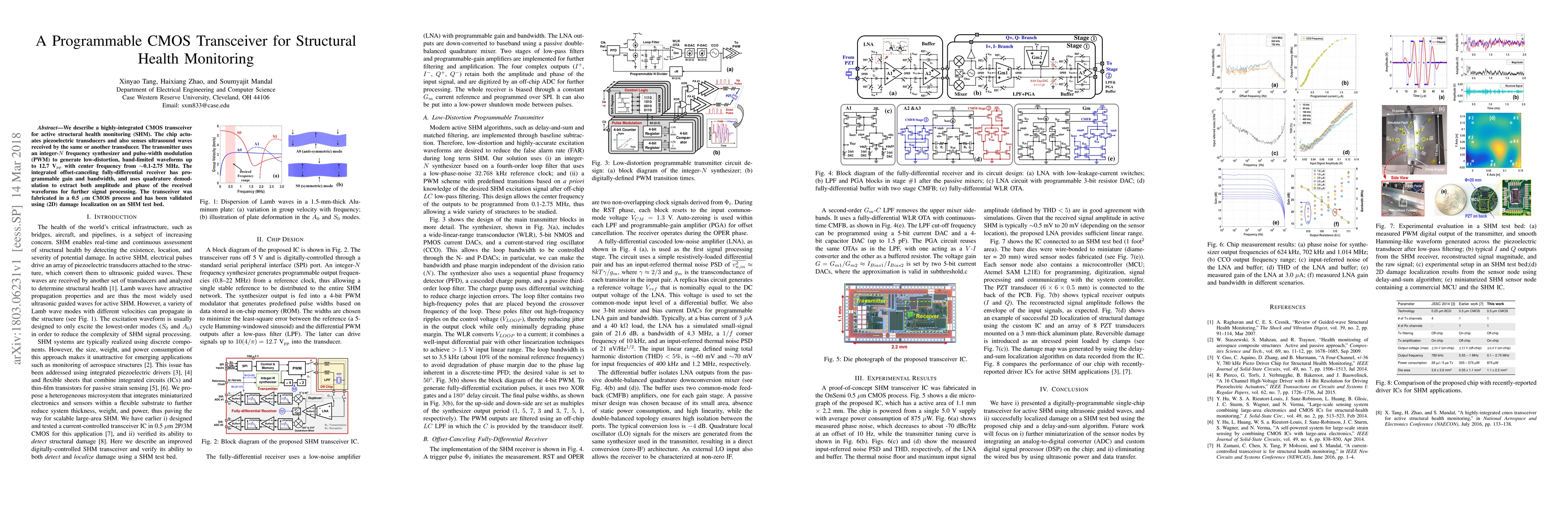 This paper presents a highly-integrated CMOS transceiver designed for active structural health monitoring, utilizing piezoelectric transducers to generate and sense ultrasound waves. The transceiver features programmable gain and bandwidth, validated through 2D damage localization in a test bed.