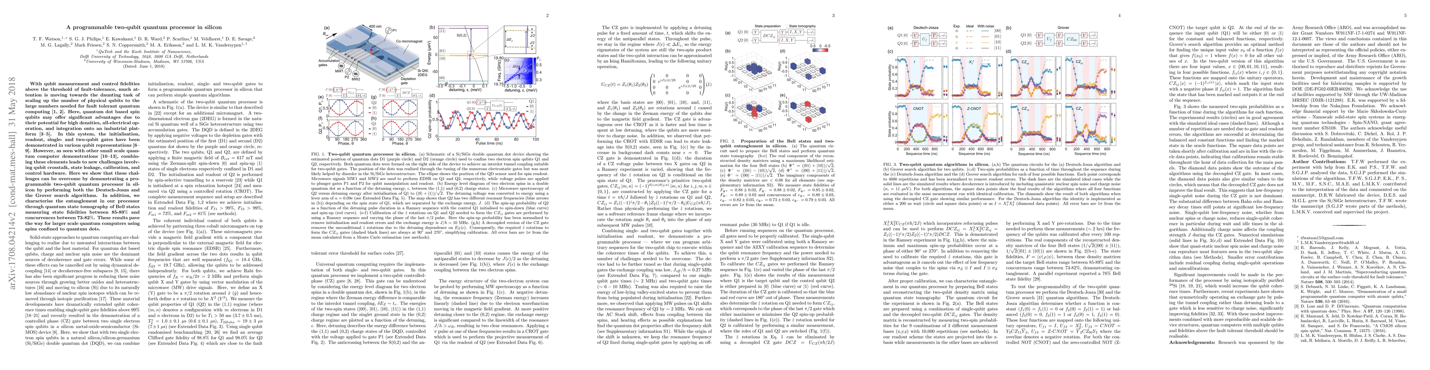 This paper details the development of a programmable two-qubit quantum processor in silicon using quantum dot spin qubits, demonstrating successful implementation of Deutsch-Josza and Grover algorithms and achieving state fidelities and entanglement concurrences between 85-89% and 73-80% respectively, highlighting potential for scaling up quantum computing.
