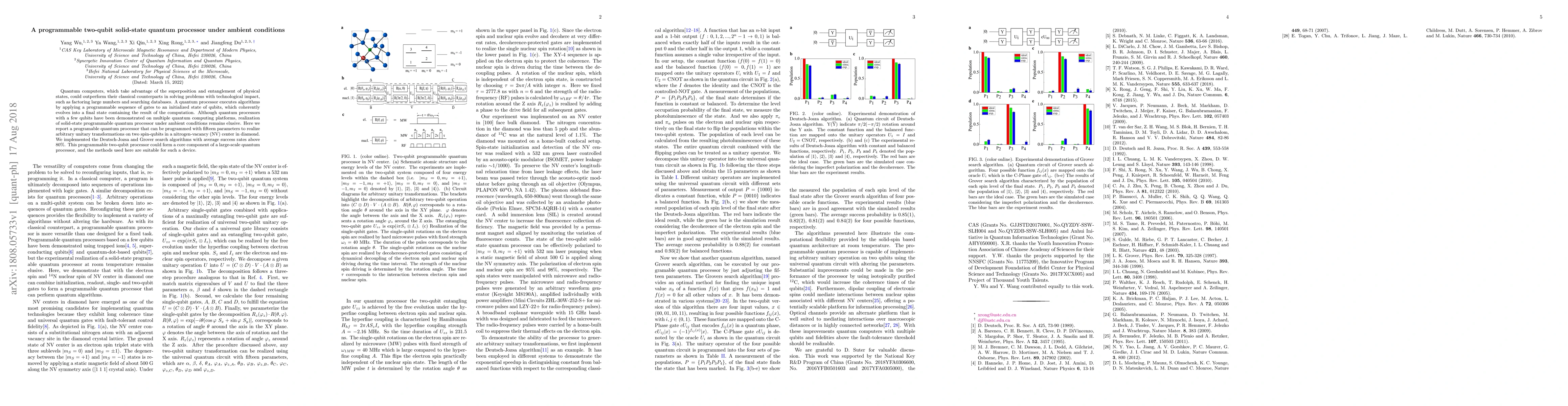 This research introduces a programmable two-qubit solid-state quantum processor operating under ambient conditions using nitrogen-vacancy centers in diamond, achieving successful execution of quantum algorithms like Deutsch-Jozsa and Grover search with over 80% success rate. The processor's design holds promise for building scalable quantum computing systems.