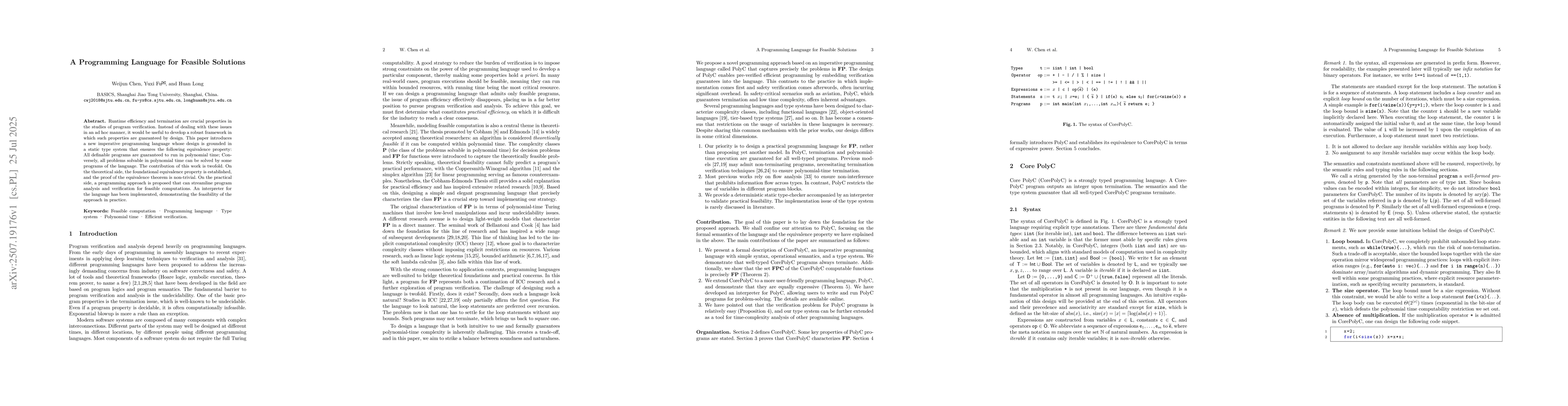 Runtime efficiency and termination are crucial properties in the studies of program verification. Instead of dealing with these issues in an ad hoc manner, it would be useful to develop a robust framework in which such properties are guaranteed by design. This paper introduces a new imperative programming language whose design is grounded in a static type system that ensures the following equivalence property: All definable programs are guaranteed to run in polynomial time; Conversely, all problems solvable in polynomial time can be solved by some programs of the language. The contribution of this work is twofold. On the theoretical side, the foundational equivalence property is established, and the proof of the equivalence theorem is non-trivial. On the practical side, a programming approach is proposed that can streamline program analysis and verification for feasible computations. An interpreter for the language has been implemented, demonstrating the feasibility of the approach in practice.