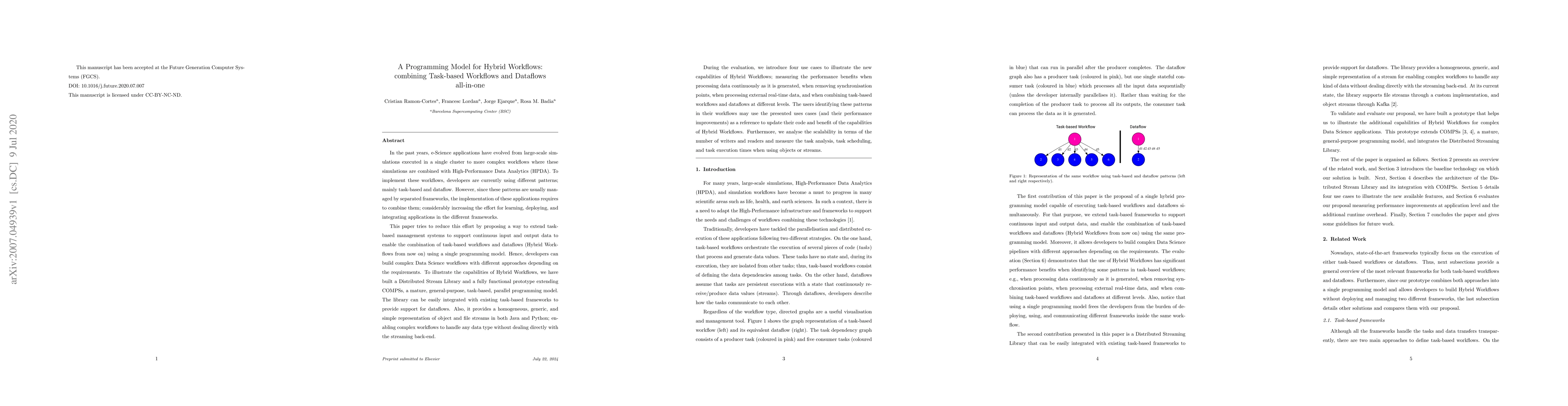 This paper tries to reduce the effort of learning, deploying, and integrating several frameworks for the development of e-Science applications that combine simulations with High-Performance Data Analytics (HPDA). We propose a way to extend task-based management systems to support continuous input and output data to enable the combination of task-based workflows and dataflows (Hybrid Workflows from now on) using a single programming model. Hence, developers can build complex Data Science workflows with different approaches depending on the requirements. To illustrate the capabilities of Hybrid Workflows, we have built a Distributed Stream Library and a fully functional prototype extending COMPSs, a mature, general-purpose, task-based, parallel programming model. The library can be easily integrated with existing task-based frameworks to provide support for dataflows. Also, it provides a homogeneous, generic, and simple representation of object and file streams in both Java and Python; enabling complex workflows to handle any data type without dealing directly with the streaming back-end.