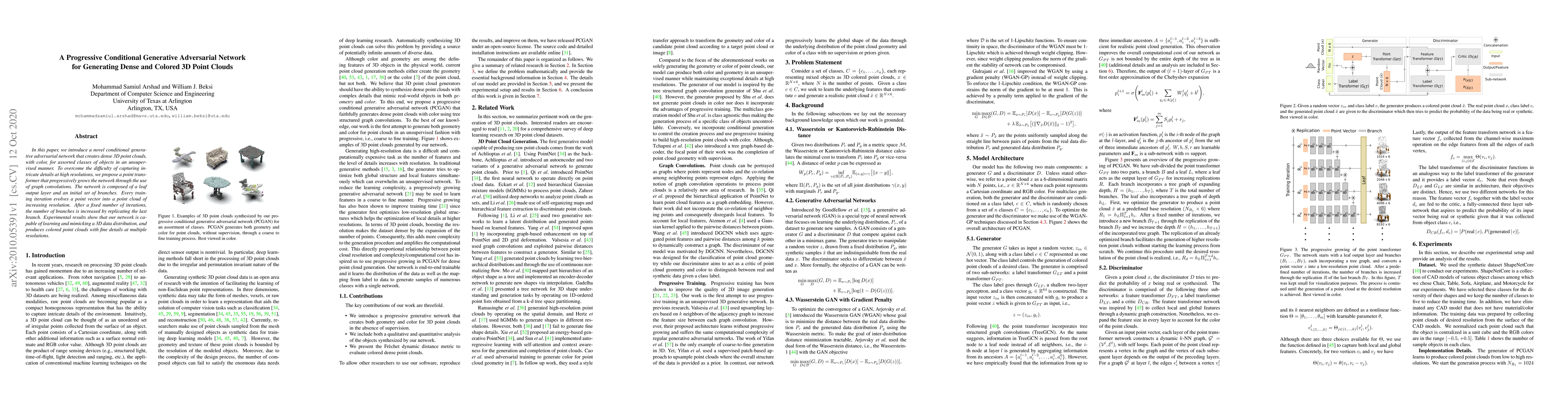 In this paper, we introduce a novel conditional generative adversarial network that creates dense 3D point clouds, with color, for assorted classes of objects in an unsupervised manner. To overcome the difficulty of capturing intricate details at high resolutions, we propose a point transformer that progressively grows the network through the use of graph convolutions. The network is composed of a leaf output layer and an initial set of branches. Every training iteration evolves a point vector into a point cloud of increasing resolution. After a fixed number of iterations, the number of branches is increased by replicating the last branch. Experimental results show that our network is capable of learning and mimicking a 3D data distribution, and produces colored point clouds with fine details at multiple resolutions.