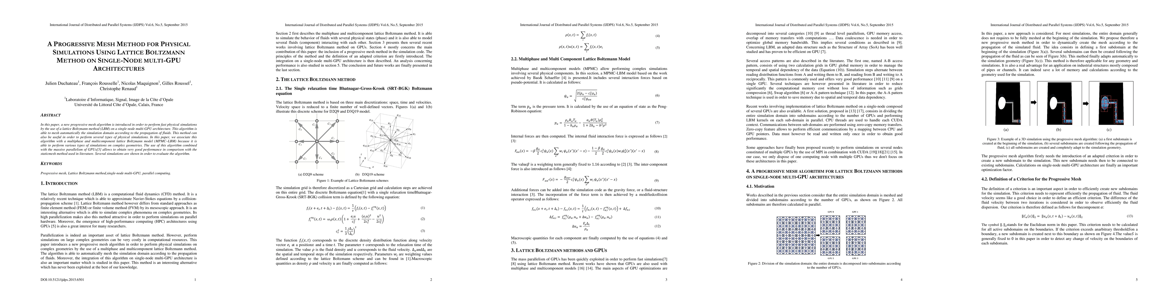 This paper introduces a progressive mesh algorithm for fast physical simulations using the lattice Boltzmann method on single-node multi-GPU architectures. The method dynamically meshes the simulation domain based on fluid propagation, achieving better performance compared to static mesh methods.