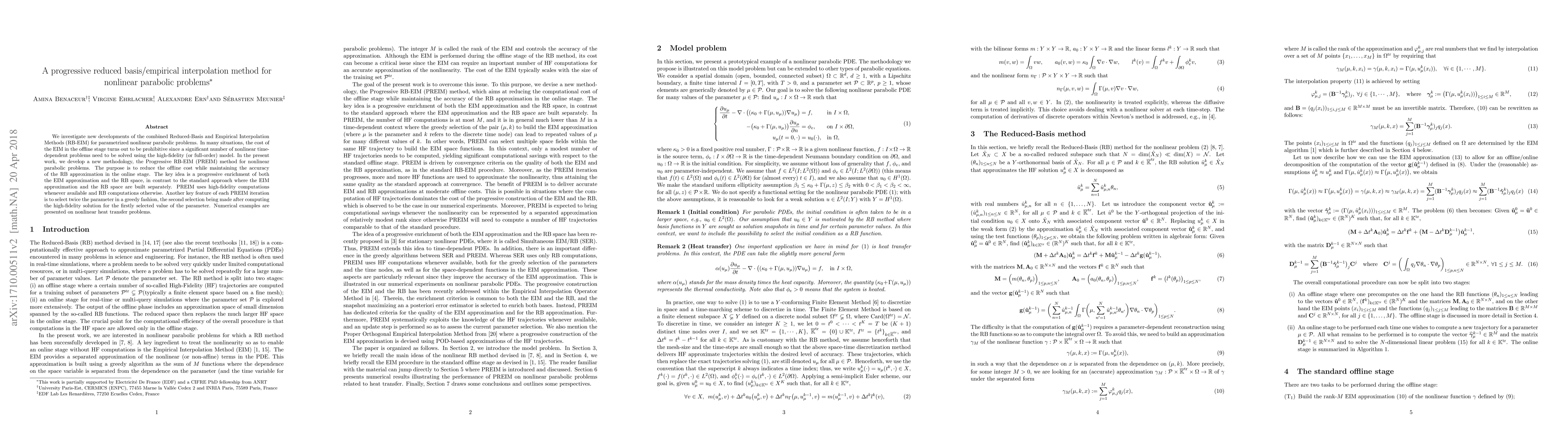 This paper introduces the Progressive Reduced Basis/Empirical Interpolation Method (PREIM) to reduce offline costs for solving parametrized nonlinear parabolic problems while maintaining accuracy. The method progressively enriches both the EIM approximation and the RB space, using high-fidelity computations when possible and leveraging reduced basis computations otherwise.