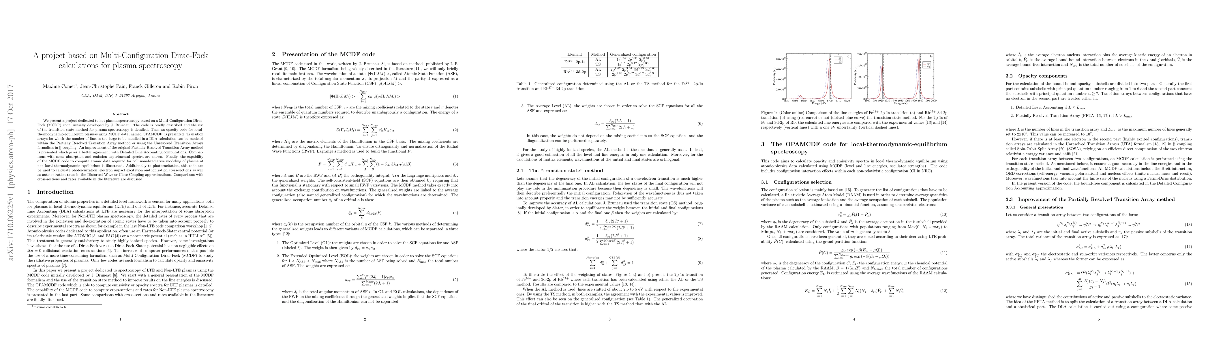 We present a project dedicated to hot plasma spectroscopy based on a Multi-Configuration Dirac-Fock (MCDF) code, initially developed by J. Bruneau. The code is briefly described and the use of the transition-state method for plasma spectroscopy is detailed. Then an opacity code for local-thermodynamic-equilibrium plasmas using MCDF data, named OPAMCDF, is presented. Transition arrays for which the number of lines is too large to be handled in a Detailed-Line-Accounting calculation can be modeled within the Partially-Resolved-Transition-Array method or using the Unresolved-Transition-Arrays formalism in jj-coupling. An improvement of the original Partially-Resolved-Transition-Array method is presented which gives a better agreement with Detailed-Line-Accounting computations. Comparisons with some absorption and emission experimental spectra are shown. Finally, the capability of the MCDF code to compute atomic data required for collisional-radiative modeling of plasma at non local thermodynamic equilibrium is illustrated. Additionally to photoexcitation, this code can be used to calculate photoionization, electron impact excitation and ionization cross-sections as well as autoionization rates in the Distorted-Wave or Close Coupling approximations. Comparisons with cross-sections and rates available in the literature are discussed.