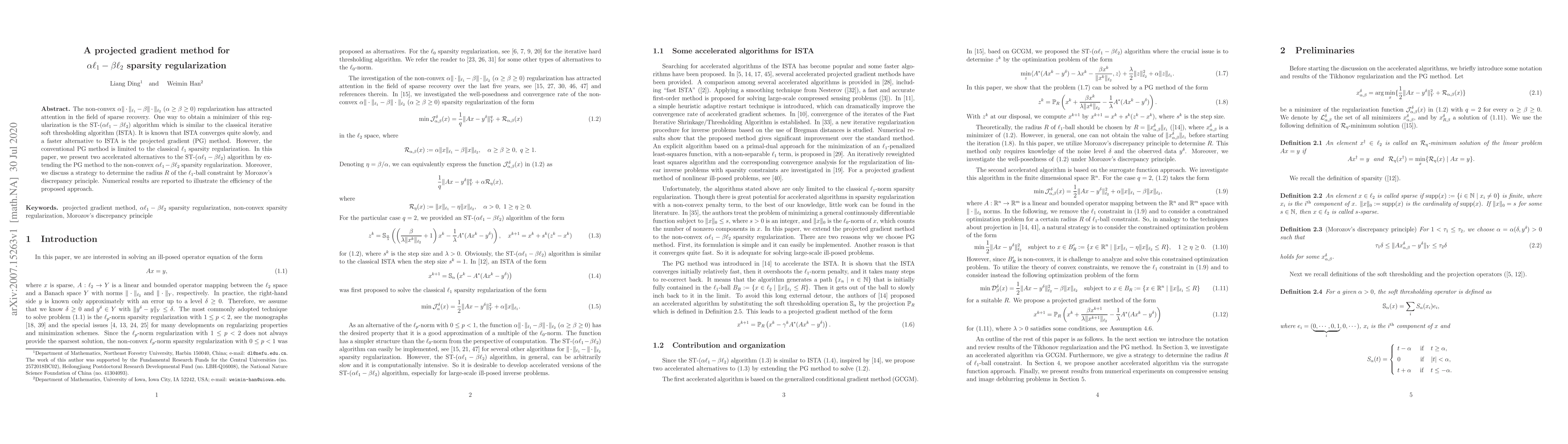 The non-convex $\alpha\|\cdot\|_{\ell_1}-\beta\| \cdot\|_{\ell_2}$ $(\alpha\ge\beta\geq0)$ regularization has attracted attention in the field of sparse recovery. One way to obtain a minimizer of this regularization is the ST-($\alpha\ell_1-\beta\ell_2$) algorithm which is similar to the classical iterative soft thresholding algorithm (ISTA). It is known that ISTA converges quite slowly, and a faster alternative to ISTA is the projected gradient (PG) method. However, the conventional PG method is limited to the classical $\ell_1$ sparsity regularization. In this paper, we present two accelerated alternatives to the ST-($\alpha\ell_1-\beta\ell_2$) algorithm by extending the PG method to the non-convex $\alpha\ell_1-\beta\ell_2$ sparsity regularization. Moreover, we discuss a strategy to determine the radius $R$ of the $\ell_1$-ball constraint by Morozov's discrepancy principle. Numerical results are reported to illustrate the efficiency of the proposed approach.