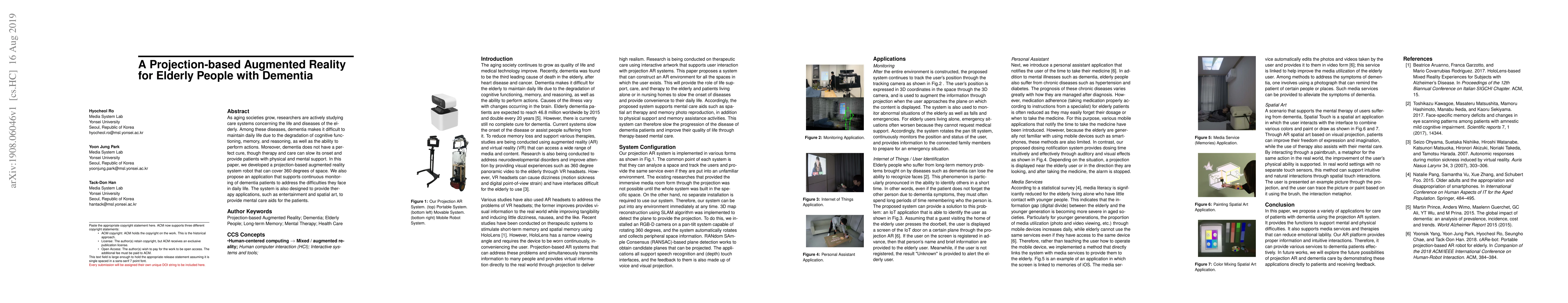 As aging societies grow, researchers are actively studying care systems concerning the life and diseases of the elderly. Among these diseases, dementia makes it difficult to maintain daily life due to the degradation of cognitive functioning, memory, and reasoning, as well as the ability to perform actions. Moreover, dementia does not have a perfect cure, though therapy and care can slow its onset and provide patients with physical and mental support. In this paper, we developed a projection-based augmented reality system robot that can cover 360 degrees of space. We also propose an application that supports continuous monitoring of dementia patients to address the difficulties they face in daily life. The system is also designed to provide therapy applications, such as entertainment and spatial art, to provide mental care aids for the patients.