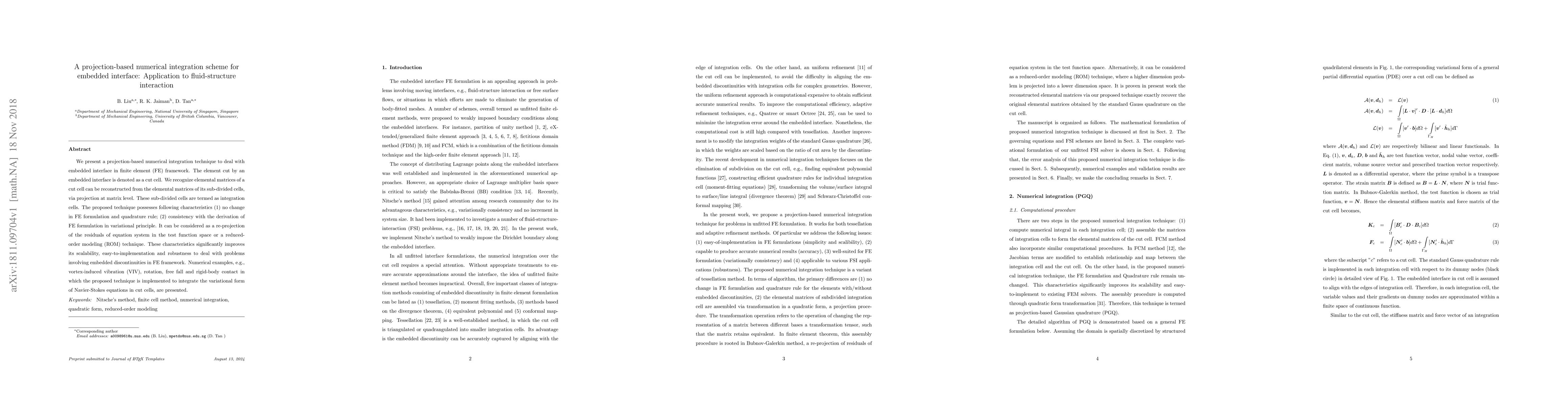 This paper introduces a projection-based numerical integration method for embedded interfaces in finite element analysis, maintaining FE formulation and quadrature rules. The technique enhances scalability and robustness for problems involving discontinuities, demonstrated through fluid-structure interaction examples like vortex-induced vibration.