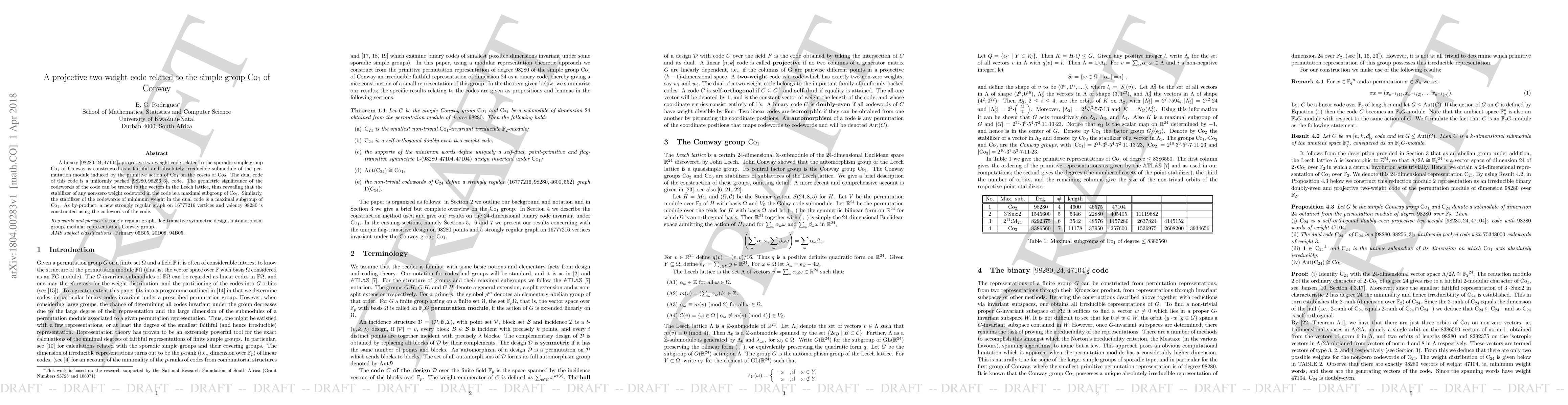 A binary $[98280, 24, 47104]_2$ projective two-weight code related to the sporadic simple group ${\rm Co}_1$ of Conway is constructed as a faithful and absolutely irreducible submodule of the permutation module induced by the primitive action of ${\rm Co}_1$ on the cosets of ${\rm Co}_2$. The dual code of this code is a uniformly packed $[98280, 98256,3]_2$ code. The geometric significance of the codewords of the code can be traced to the vectors in the Leech lattice, thus revealing that the stabilizer of any non-zero weight codeword in the code is a maximal subgroup of ${\rm Co}_1$. Similarly, the stabilizer of the codewords of minimum weight in the dual code is a maximal subgroup of ${\rm Co}_1$. As by-product, a new strongly regular graph on 16777216 vertices and valency 98280 is constructed using the codewords of the code.