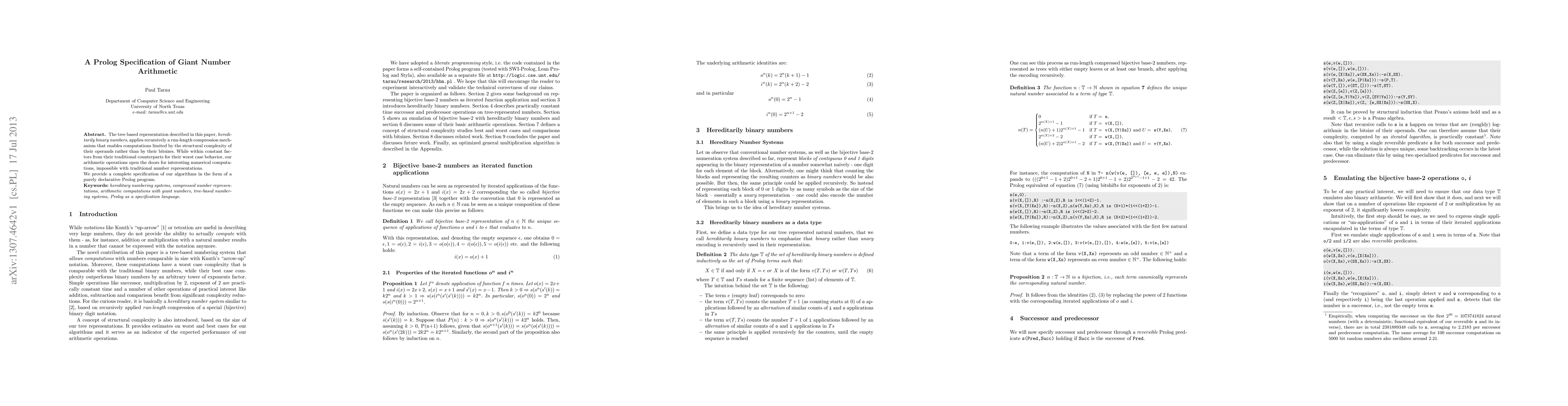 The tree based representation described in this paper, hereditarily binary numbers, applies recursively a run-length compression mechanism that enables computations limited by the structural complexity of their operands rather than by their bitsizes. While within constant factors from their traditional counterparts for their worst case behavior, our arithmetic operations open the doors for interesting numerical computations, impossible with traditional number representations. We provide a complete specification of our algorithms in the form of a purely declarative Prolog program.