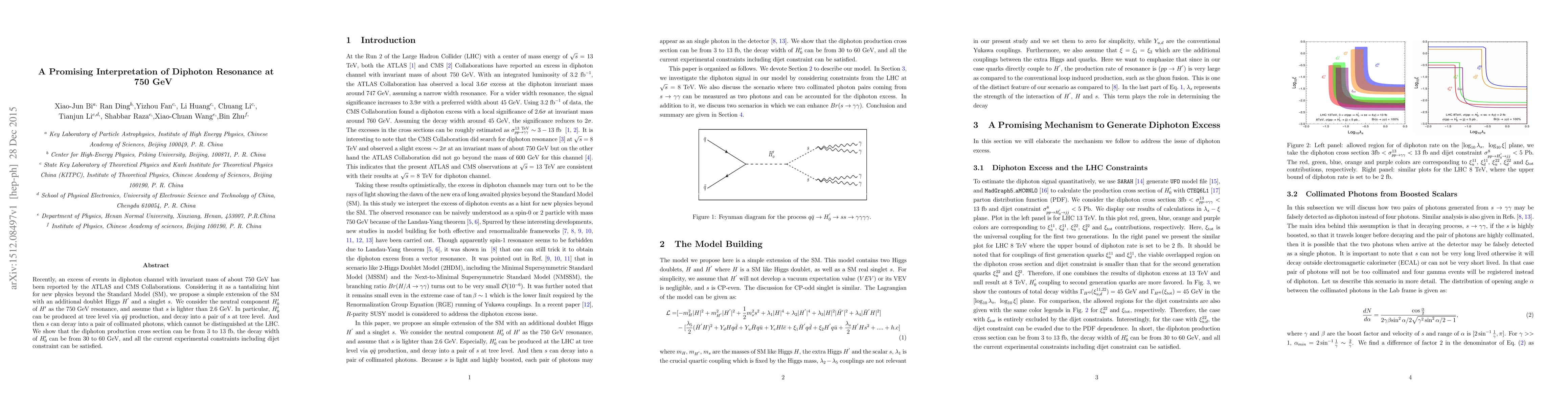 This research proposes a new theoretical model extending the Standard Model to explain a 750 GeV diphoton resonance, introducing a doublet Higgs $H^{'}$ and a singlet $s$. The neutral component $H^{\prime }_0$ is suggested as the resonance, which decays into a pair of $s$ and subsequently into collimated photons, aligning with observed data while satisfying experimental constraints.