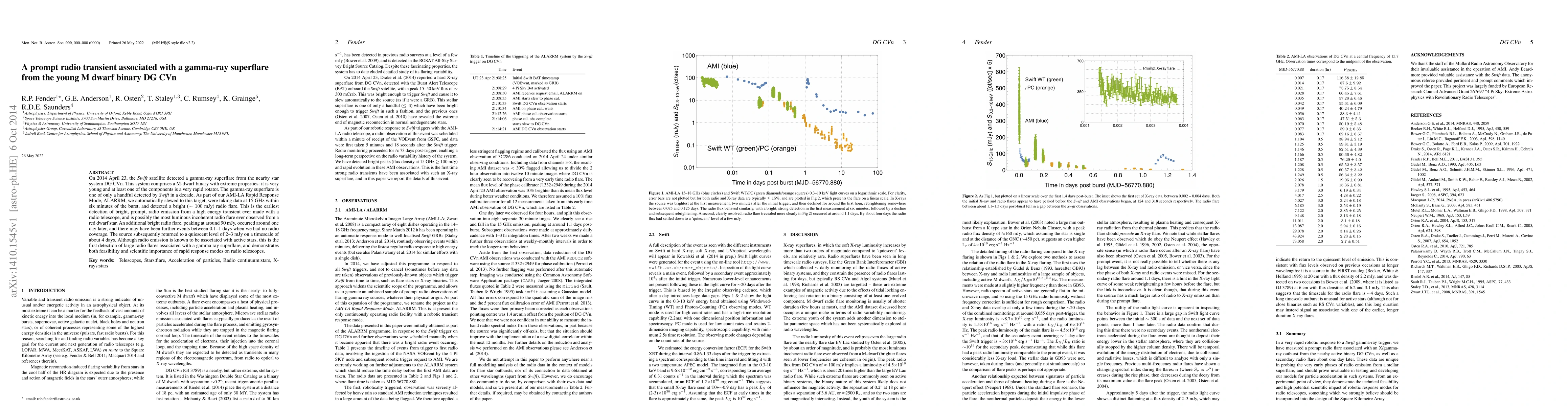 On 2014 April 23, the Swift satellite detected a gamma-ray superflare from the nearby star system DG CVn. This system comprises a M-dwarf binary with extreme properties: it is very young and at least one of the components is a very rapid rotator. The gamma-ray superflare is one of only a handful detected by Swift in a decade. As part of our AMI-LA Rapid Response Mode, ALARRM, we automatically slewed to this target, were taking data at 15 GHz within six minutes of the burst, and detected a bright (~100 mJy) radio flare. This is the earliest detection of bright, prompt, radio emission from a high energy transient ever made with a radio telescope, and is possibly the most luminous incoherent radio flare ever observed from a red dwarf star. An additional bright radio flare, peaking at around 90 mJy, occurred around one day later, and there may have been further events between 0.1-1 days when we had no radio coverage. The source subsequently returned to a quiescent level of 2-3 mJy on a timescale of about 4 days. Although radio emission is known to be associated with active stars, this is the first detection of large radio flares associated with a gamma ray superflare, and demonstrates both feasibility and scientific importance of rapid response modes on radio telescopes.