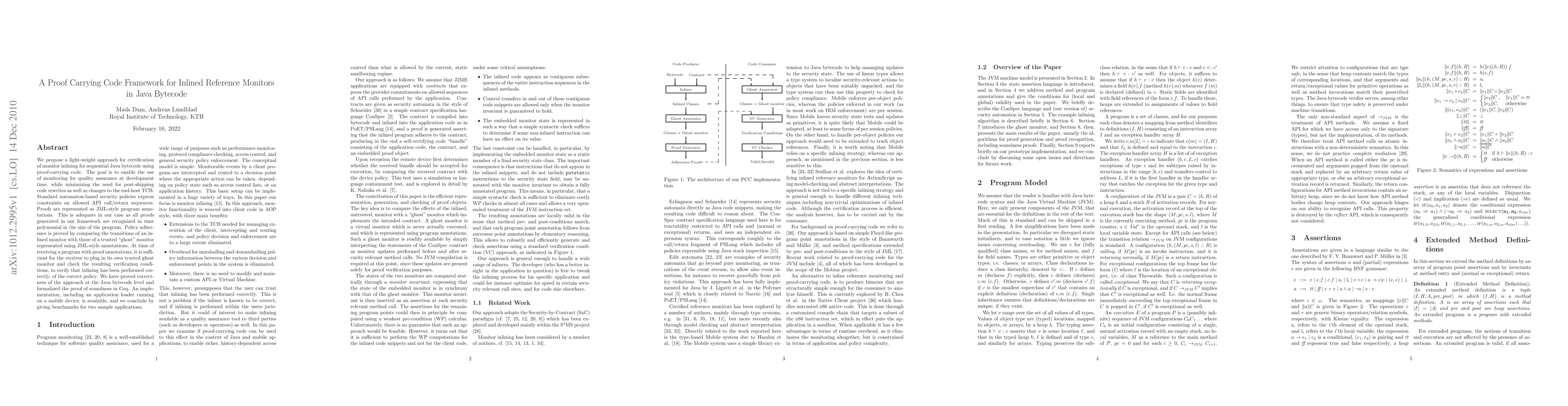We propose a light-weight approach for certification of monitor inlining for sequential Java bytecode using proof-carrying code. The goal is to enable the use of monitoring for quality assurance at development time, while minimizing the need for post-shipping code rewrites as well as changes to the end-host TCB. Standard automaton-based security policies express constraints on allowed API call/return sequences. Proofs are represented as JML-style program annotations. This is adequate in our case as all proofs generated in our framework are recognized in time polynomial in the size of the program. Policy adherence is proved by comparing the transitions of an inlined monitor with those of a trusted "ghost" monitor represented using JML-style annotations. At time of receiving a program with proof annotations, it is sufficient for the receiver to plug in its own trusted ghost monitor and check the resulting verification conditions, to verify that inlining has been performed correctly, of the correct policy. We have proved correctness of the approach at the Java bytecode level and formalized the proof of soundness in Coq. An implementation, including an application loader running on a mobile device, is available, and we conclude by giving benchmarks for two sample applications.