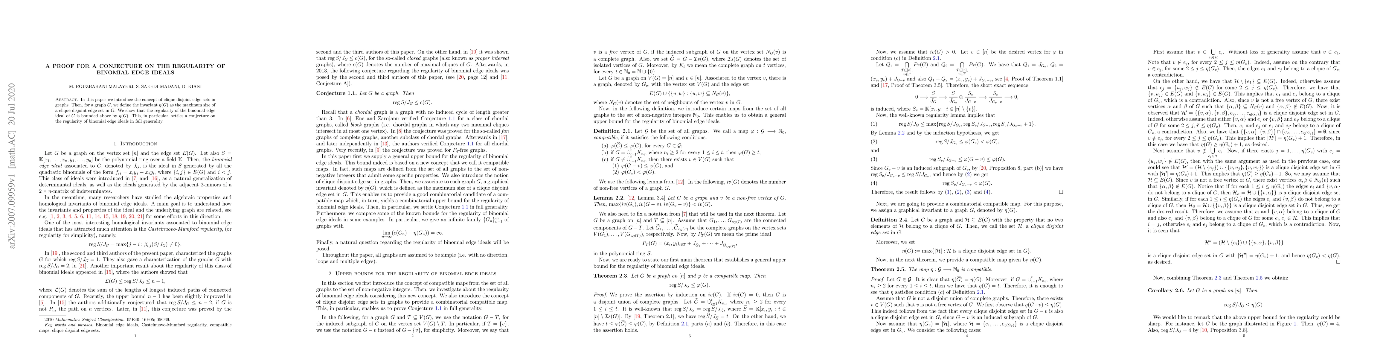 A research paper proves a conjecture on the regularity of binomial edge ideals in graphs, showing that its regularity is bounded above by the maximum size of a clique disjoint edge set.