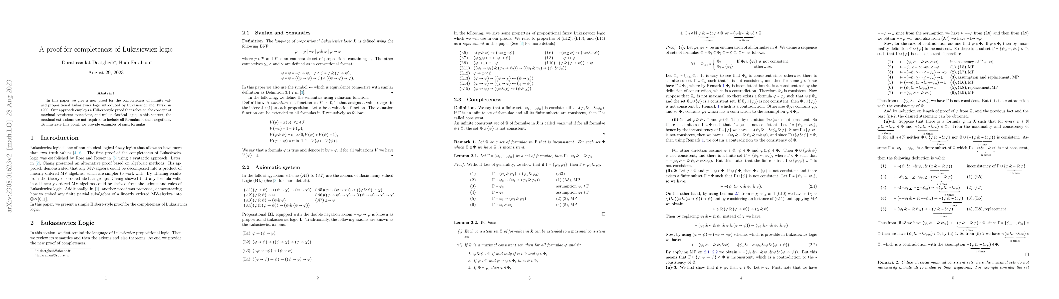This paper presents a novel Hilbert-style proof for the completeness of infinite-valued propositional \L ukasiewicz logic, utilizing maximal consistent extensions that do not necessarily include all formulas or their negations, unlike classical logic. Examples are provided to clarify this unique approach.