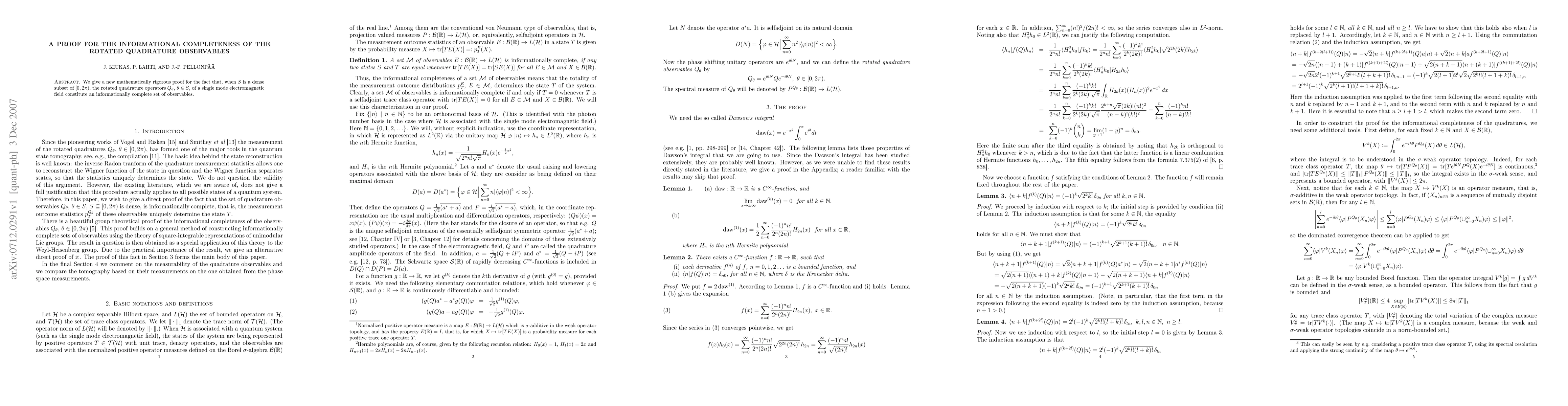 We give a new mathematically rigorous proof for the fact that, when $S$ is a dense subset of $[0,2\pi)$, the rotated quadrature operators $Q_\theta$, $\theta\in S$, of a single mode electromagnetic field constitute an informationally complete set of observables.