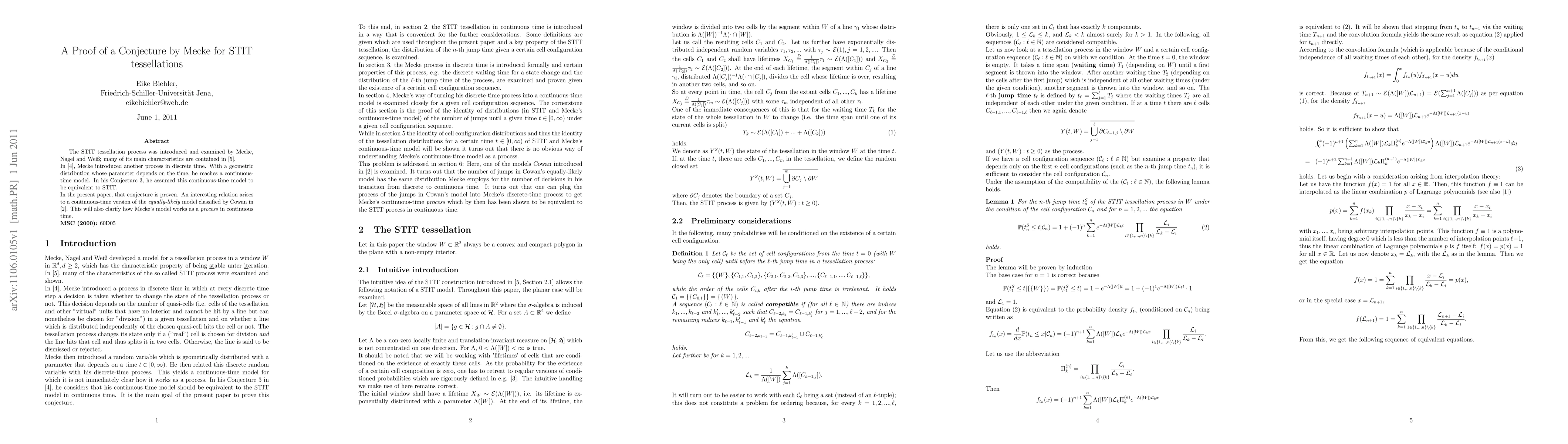The STIT tessellation process was introduced and examined by Mecke, Nagel and Wei{\ss}; many of its main characteristics are contained in a paper published by Nagel and Wei{\ss} in 2005. In a paper published in 2010, Mecke introduced another process in discrete time. With a geometric distribution whose parameter depends on the time, he reaches a continuous-time model. In his Conjecture 3, he assumed this continuous-time model to be equivalent to STIT. In the present paper, that conjecture is proven. An interesting relation arises to a continuous-time version of the equally-likely model classified by Cowan in 2010. This will also clarify how Mecke's model works as a process in continuous time.