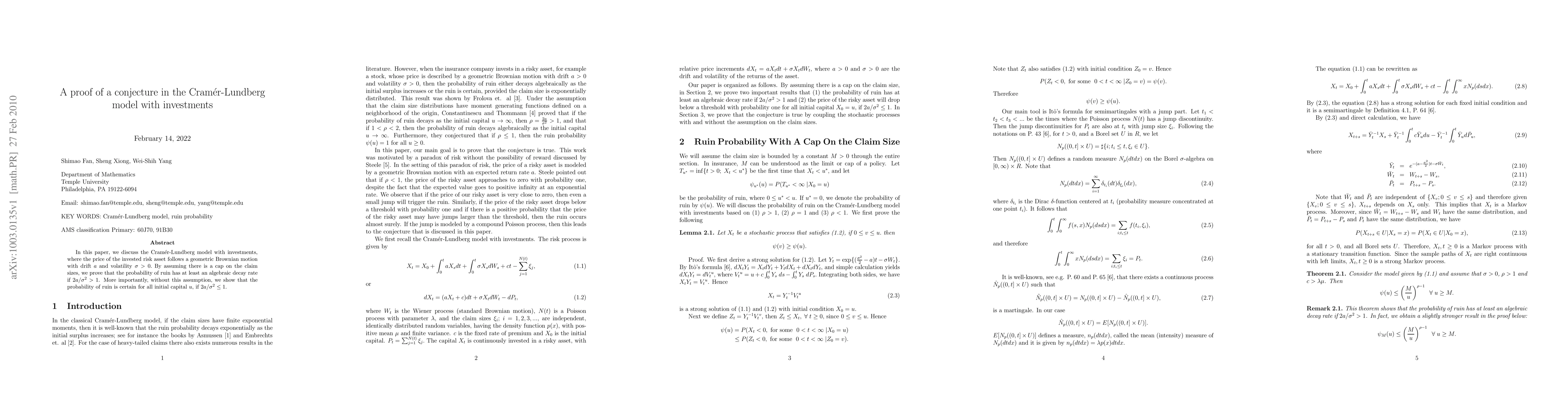 This paper proves a conjecture in the Cramér-Lundberg model with investment, showing that the probability of ruin has an algebraic decay rate if the ratio $2a/\sigma^2 > 1$, and that ruin is certain if $2a/\sigma^2 \le 1$, regardless of initial capital.