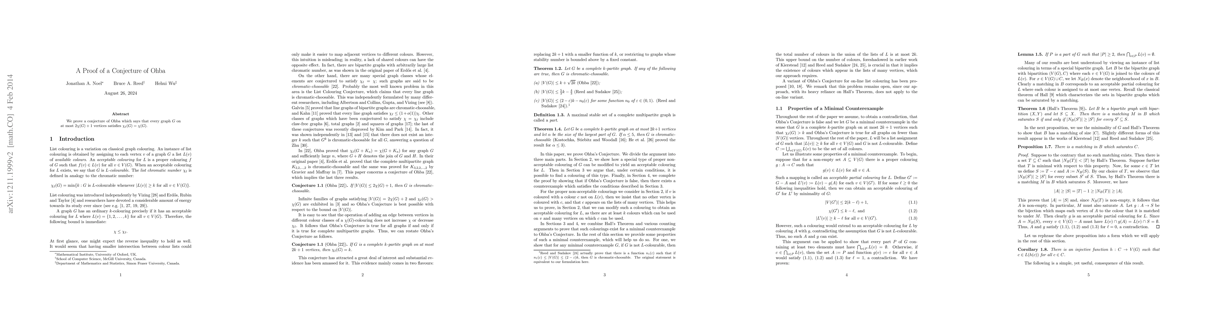 Summary: This paper proves Ohba's conjecture that for any graph $G$ with at most $2\chi(G)+1$ vertices, the chromatic index $\chi_\ell(G)$ equals the chromatic number $\chi(G)$. This resolves a longstanding question in graph theory regarding the relationship between these two graph parameters.