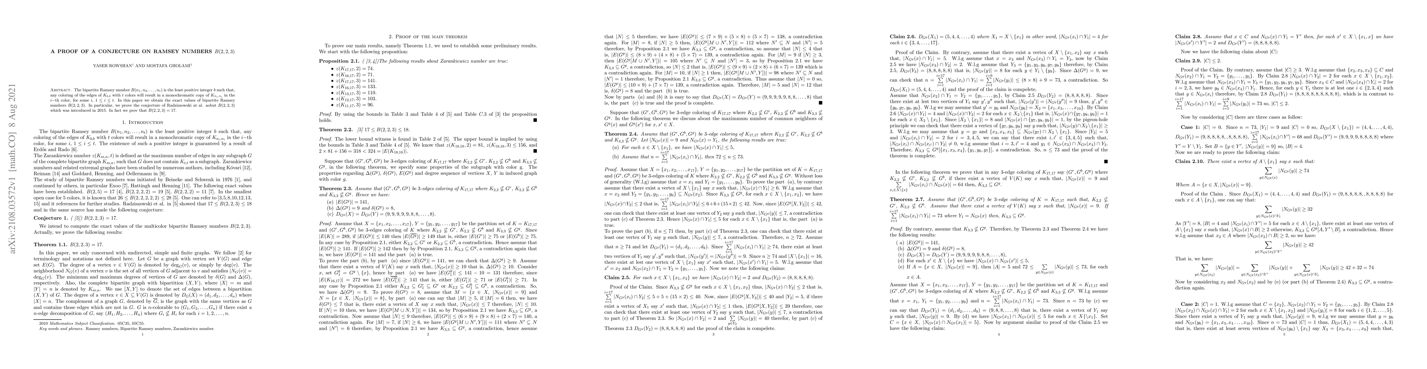 This paper proves the conjecture about the bipartite Ramsey number B(2,2,3), establishing its exact value as 17. The proof contributes to understanding the minimum number of vertices required in a complete bipartite graph to ensure a monochromatic subgraph of a certain size under edge coloring with multiple colors.