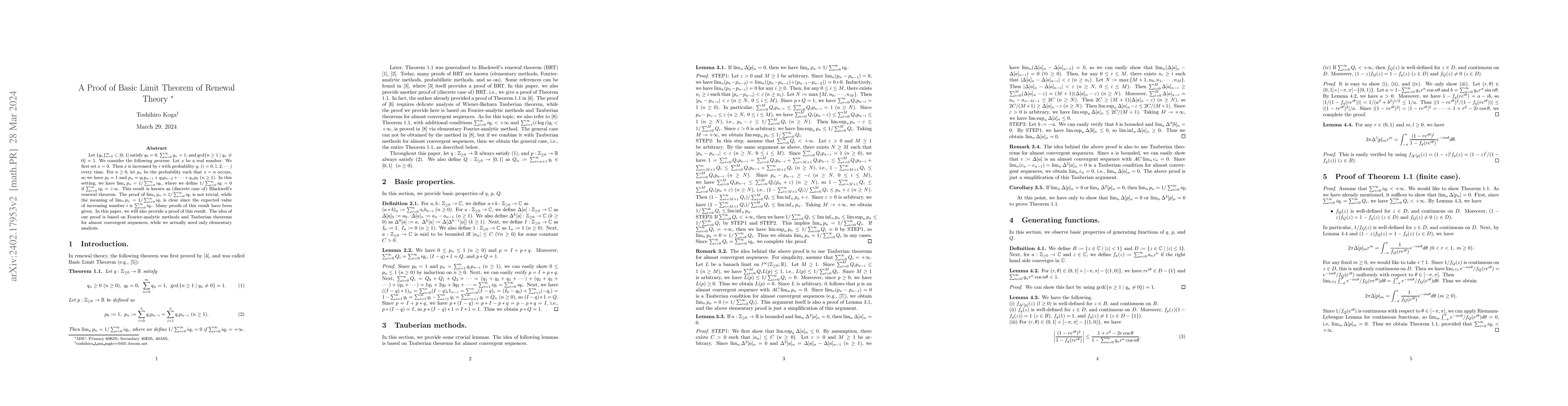 Let $\{q_n\}_{n=0}^\infty\subset [0,1]$ satisfy $q_0=0$, $\sum_{n=0}^\infty q_n=1$, and $\gcd\{n\geq 1\mid q_n\neq 0\}=1$. We consider the following process: Let $x$ be a real number. We first set $x=0$. Then $x$ is increased by $i$ with probability $q_i~(i=0,1,2,\cdots)$ every time. For $n\geq 0$, let $p_n$ be the probability such that $x=n$ occurs, so we have $p_0=1$ and $p_n=q_1p_{n-1}+q_2p_{n-2}+\cdots+q_np_0~(n\geq 1)$. In this setting, we have $\lim_n p_n=1/\sum_{i=0}^\infty iq_i$, where we define $1/\sum_{i=0}^\infty iq_i=0$ if $\sum_{i=0}^\infty iq_i=+\infty$. This result is known as (discrete case of) Blackwell's renewal theorem. The proof of $\lim_n p_n=1/\sum_{i=0}^\infty iq_i$ is not trivial, while the meaning of $\lim_n p_n=1/\sum_{i=0}^\infty iq_i$ is clear since the expected value of increasing number $i$ is $\sum_{i=0}^\infty iq_i$. Many proofs of this result have been given. In this paper, we will also provide a proof of this result. The idea of our proof is based on Fourier-analytic methods and Tauberian theorems for almost convergent sequences, while we actually need only elementary analysis.