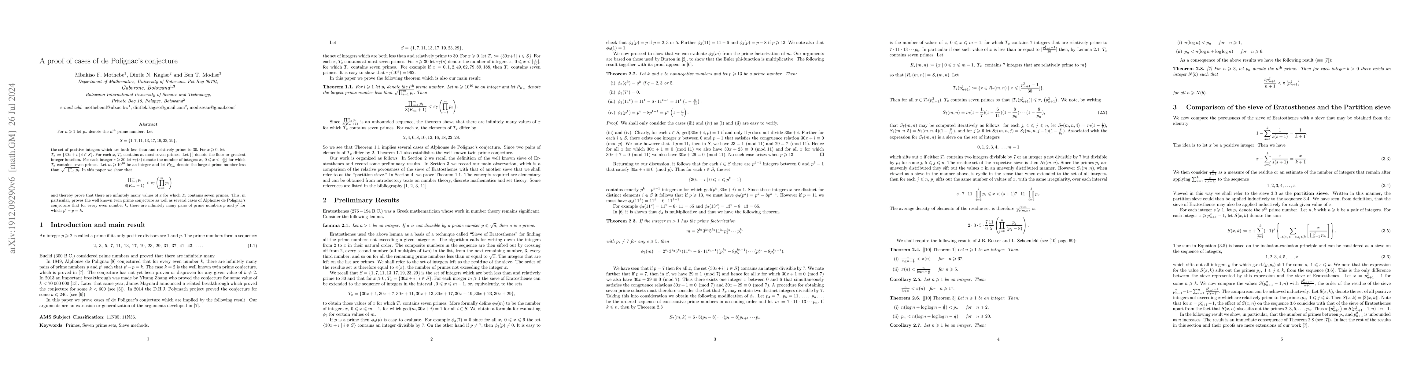 For $n \geq 1$ let $ p_n $ denote the $n^{\rm th}$ prime number. Let $$S= \{1,7,11,13,17,19,23,29 \},$$ the set of positive integers which are both less than and relatively prime to $30.$ For $ x \geq 0,$ let $T_x := \{ 30x+i \; | \; i \in S\}.$ For each $ x,$ $T_x$ contains at most seven primes. Let $[ \; ]$ denote the floor or greatest integer function. For each integer $s \geq 30$ let $\pi_7(s)$ denote the number of integers $x, \; 0 \leq x < [\frac {s}{30}]$ for which $T_x$ contains seven primes. In this paper we show that there are infinitely many values of $x$ for which $T_x$ contains seven primes. This in turn proves several cases of Alphonse de Polignac's conjecture that for every even number $k,$ there are infinitely many pairs of prime numbers $p$ and $p'$ for which $p-p' = k.$